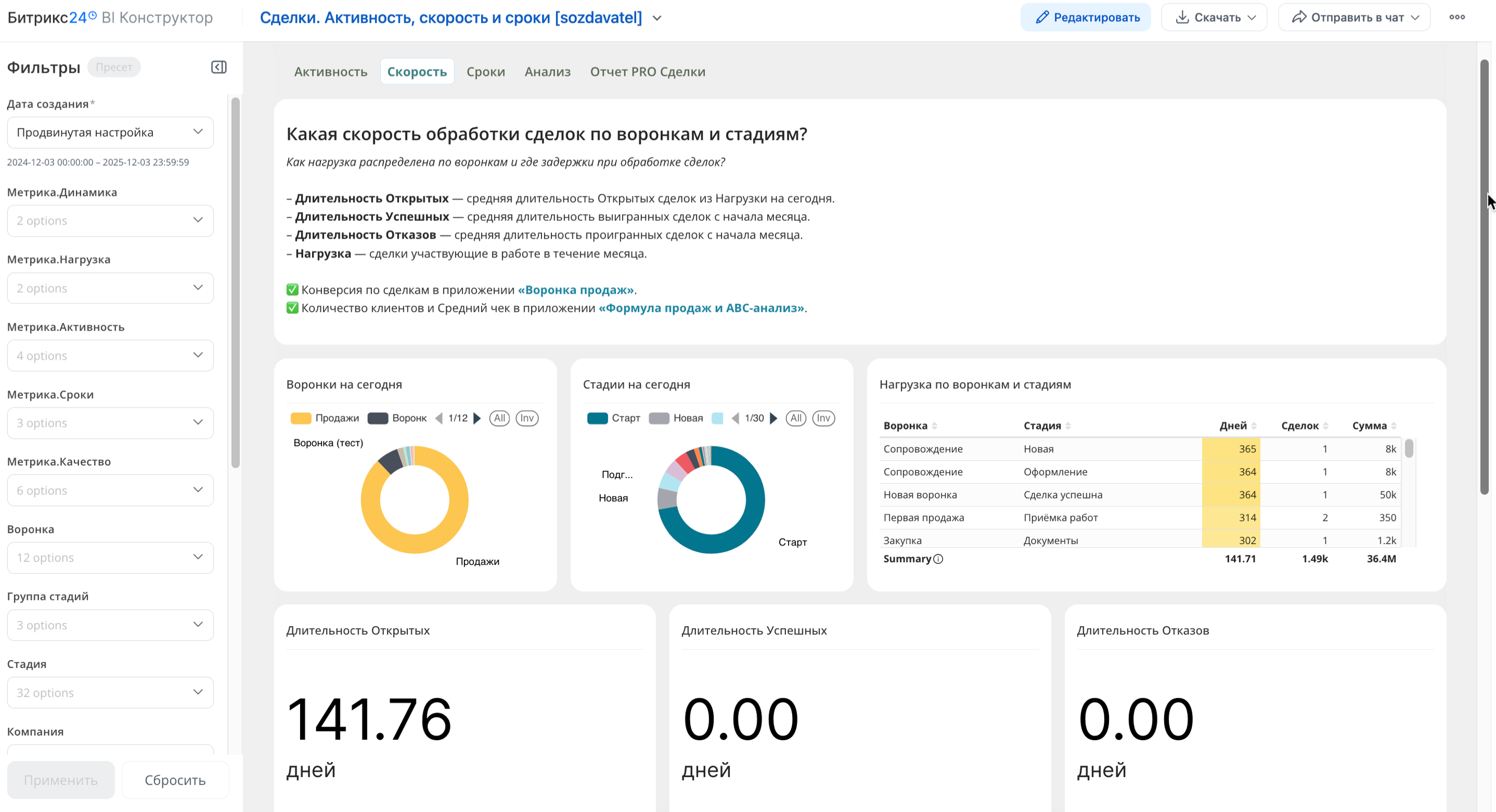 Вкладка «Скорость» показывает, насколько быстро движутся сделки к закрытию и на каких этапах процесс замедляется. Круговые диаграммы и таблицы по воронкам помогают сразу увидеть, на каких стадиях происходит накопление — как по количеству, так и по сумме. Под длительностью подразумевается промежуток от даты создания до сегодня — для открытых сделок, и до даты закрытия — для завершенных.