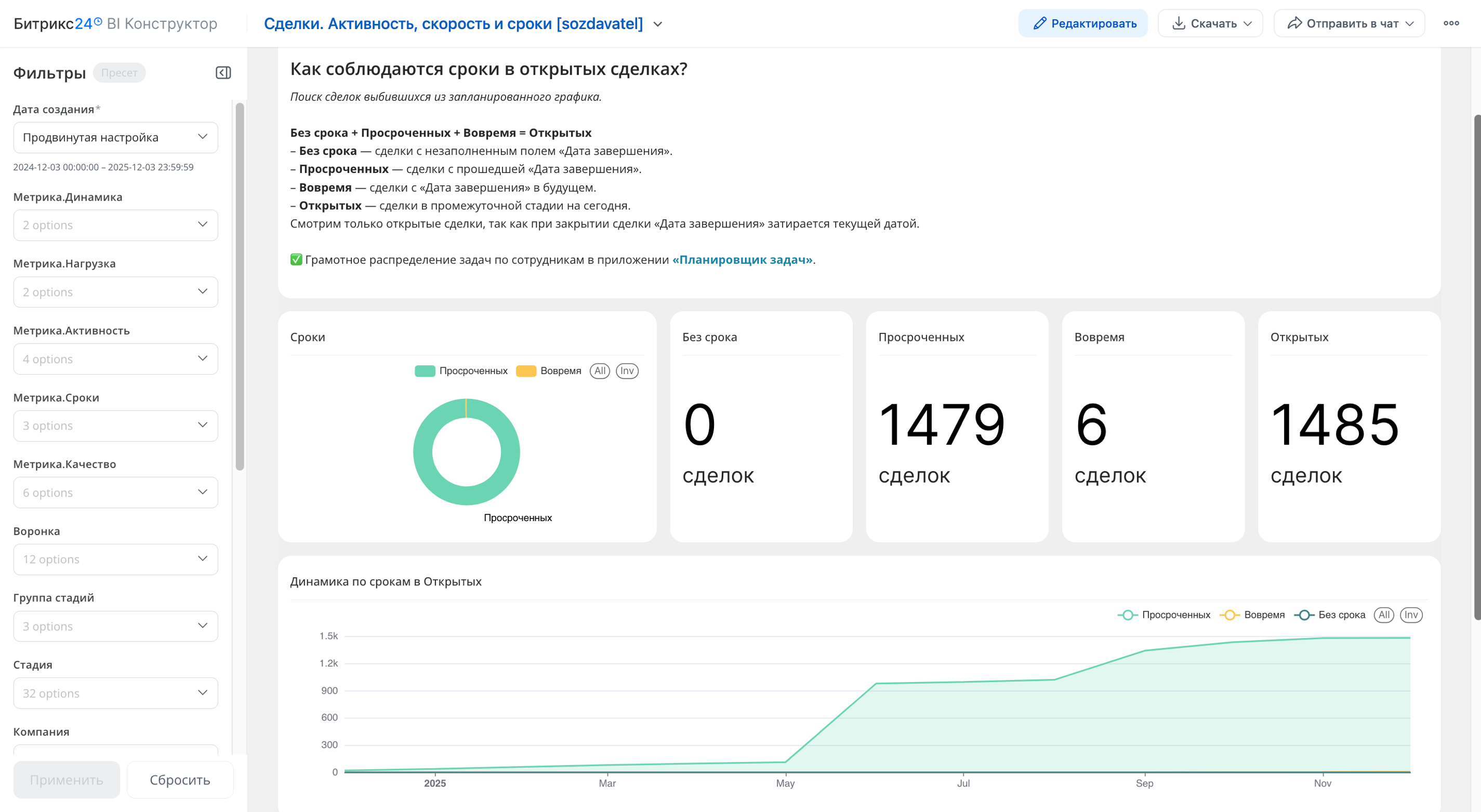 - метрикам Сроков (Вовремя / Закрытые / Просроченные);