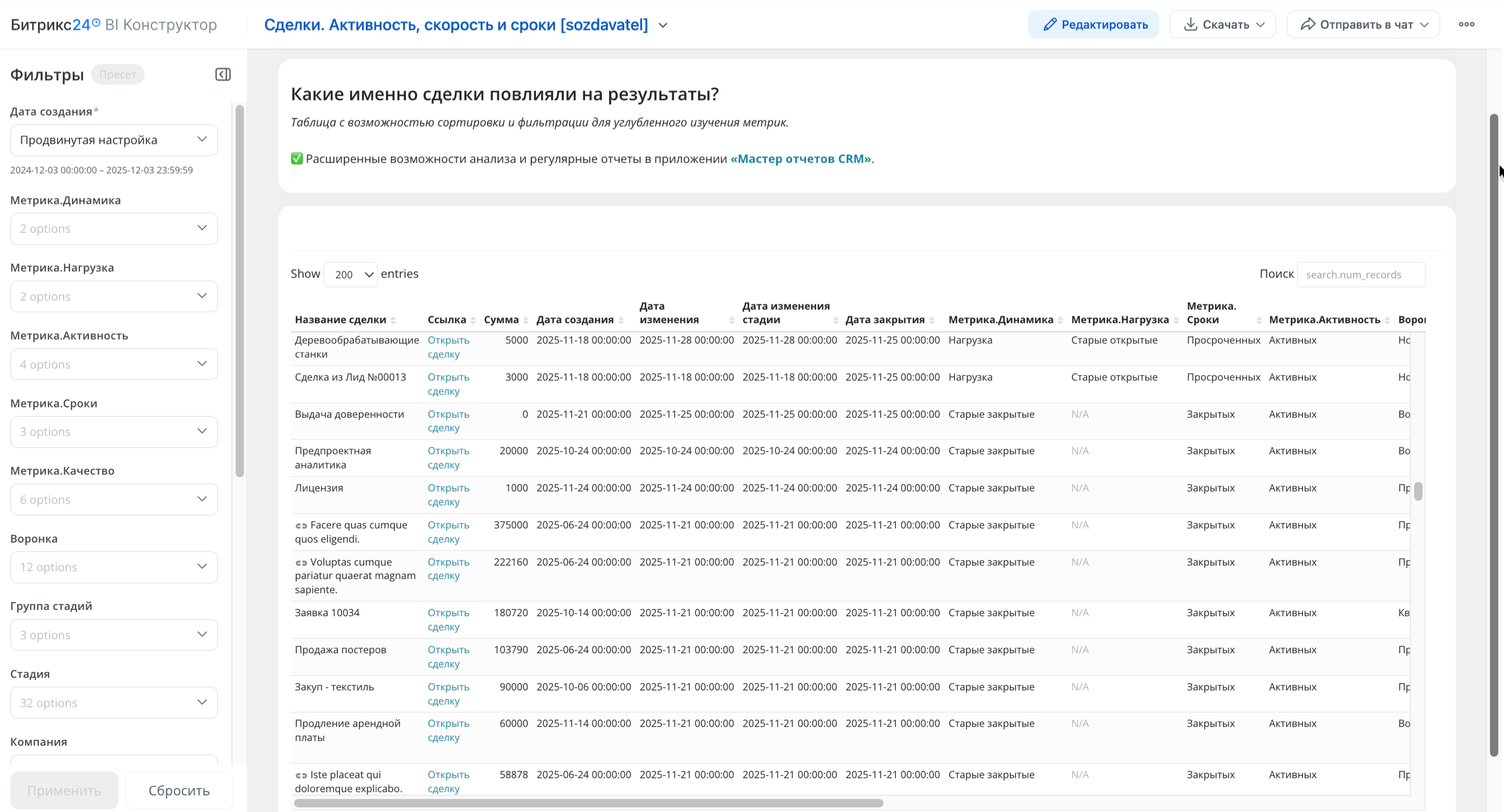 Сделки. Активность, скорость и сроки — аналитический BI-отчёт, который помогает контролировать текущее состояние работ и вовлечённость отдела продаж.