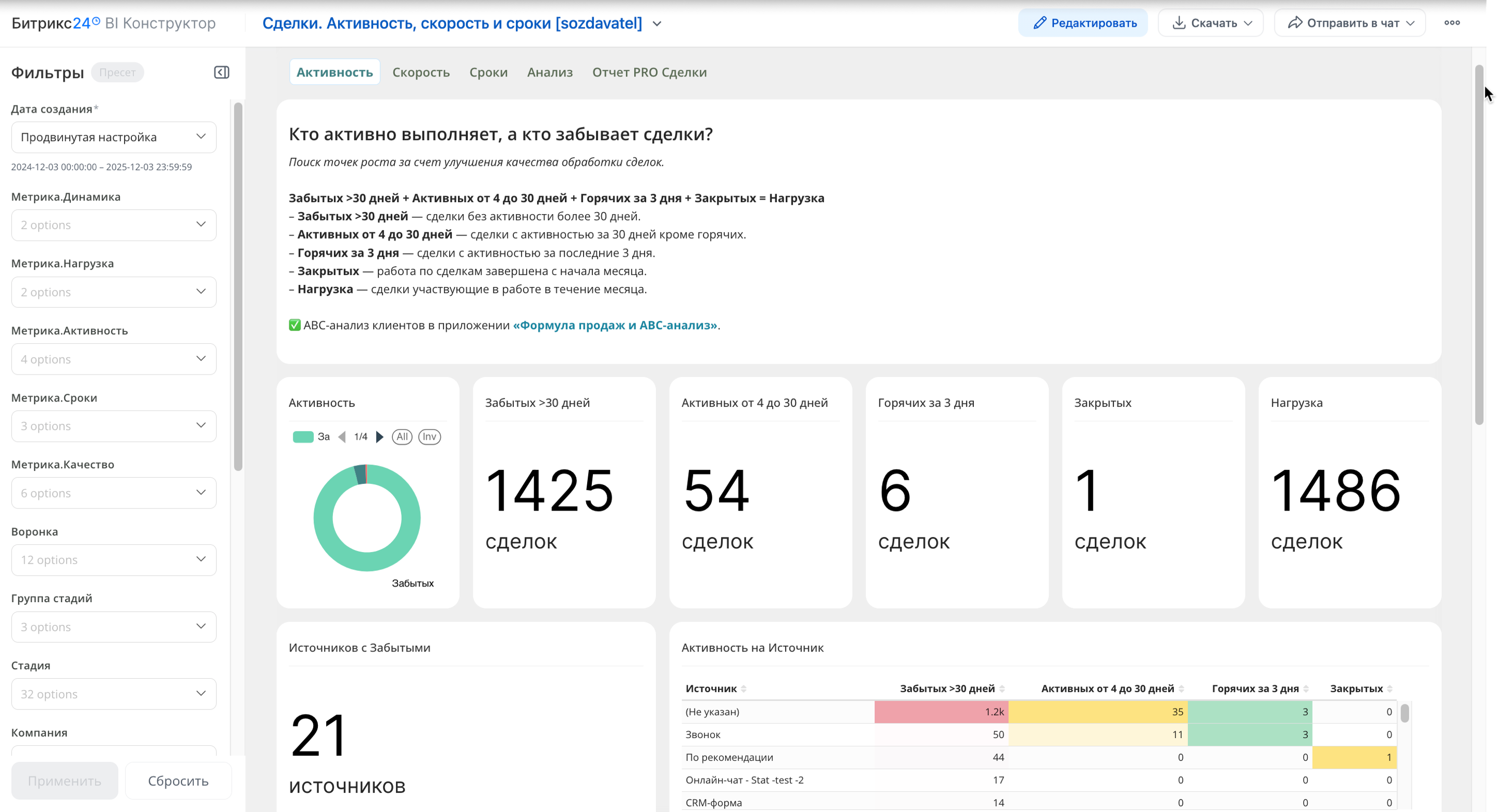 - метрикам Активности (Активные / Горячие / Забытые / Закрытые);