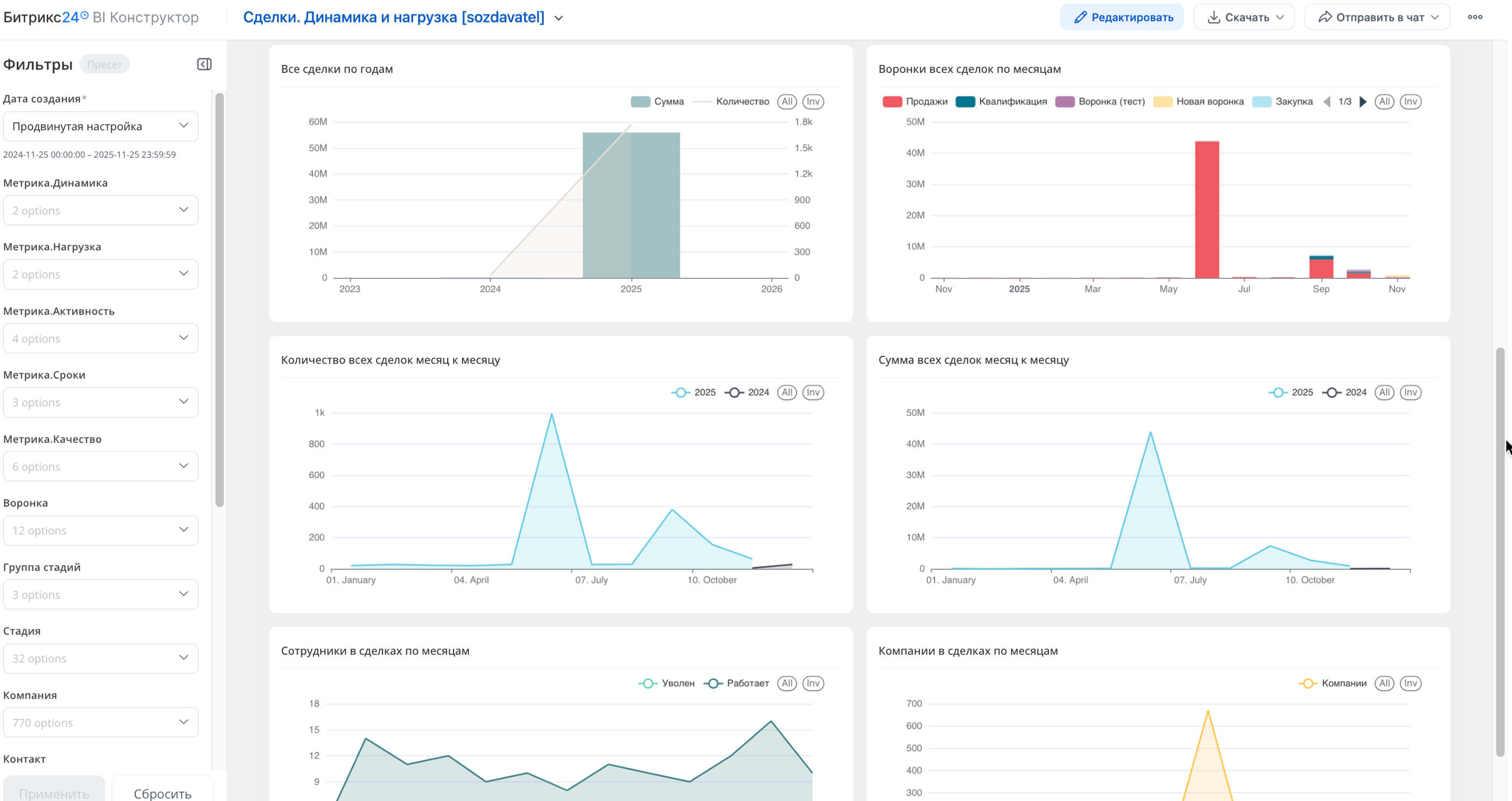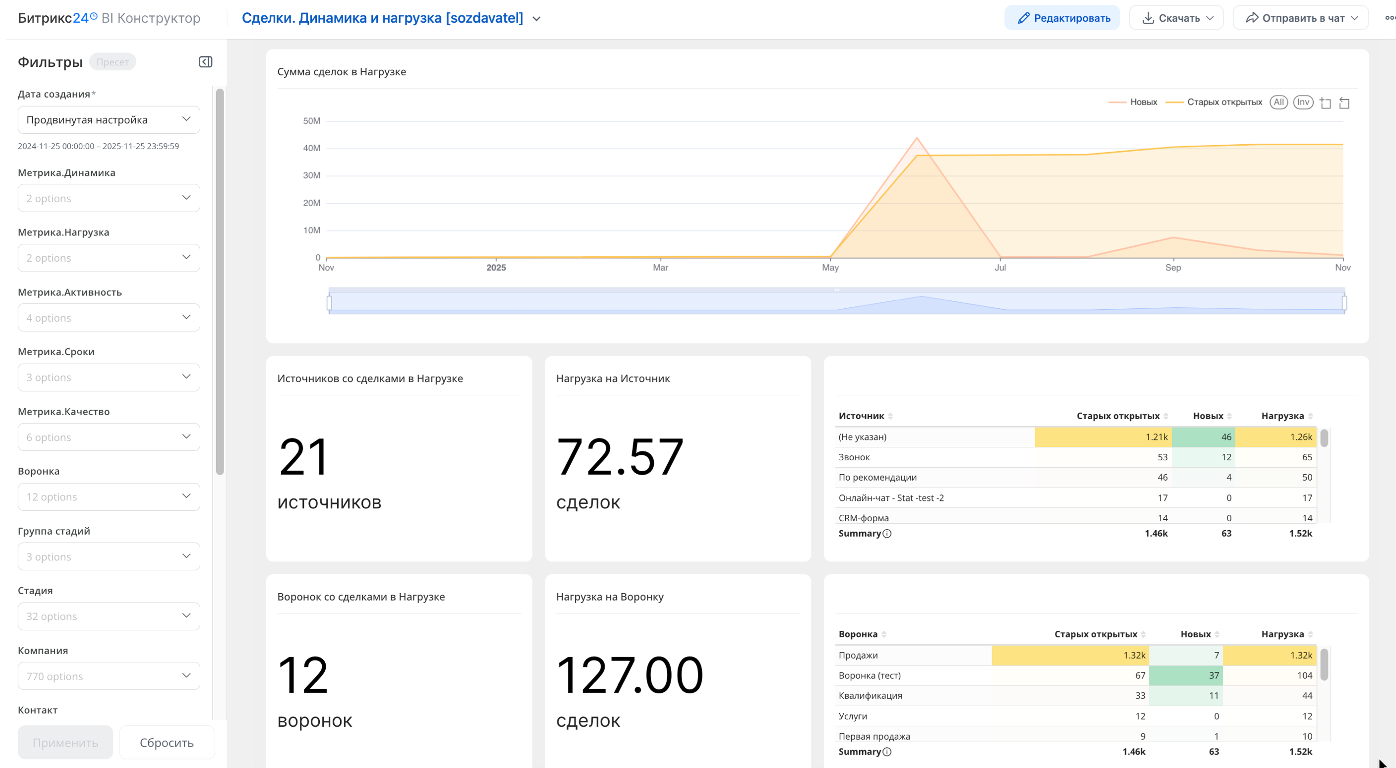 Сделки. Динамика и нагрузка — аналитический BI‑отчет, который показывает движение сделок в CRM, общий объём работы за текущий месяц и то, из чего он складывается.