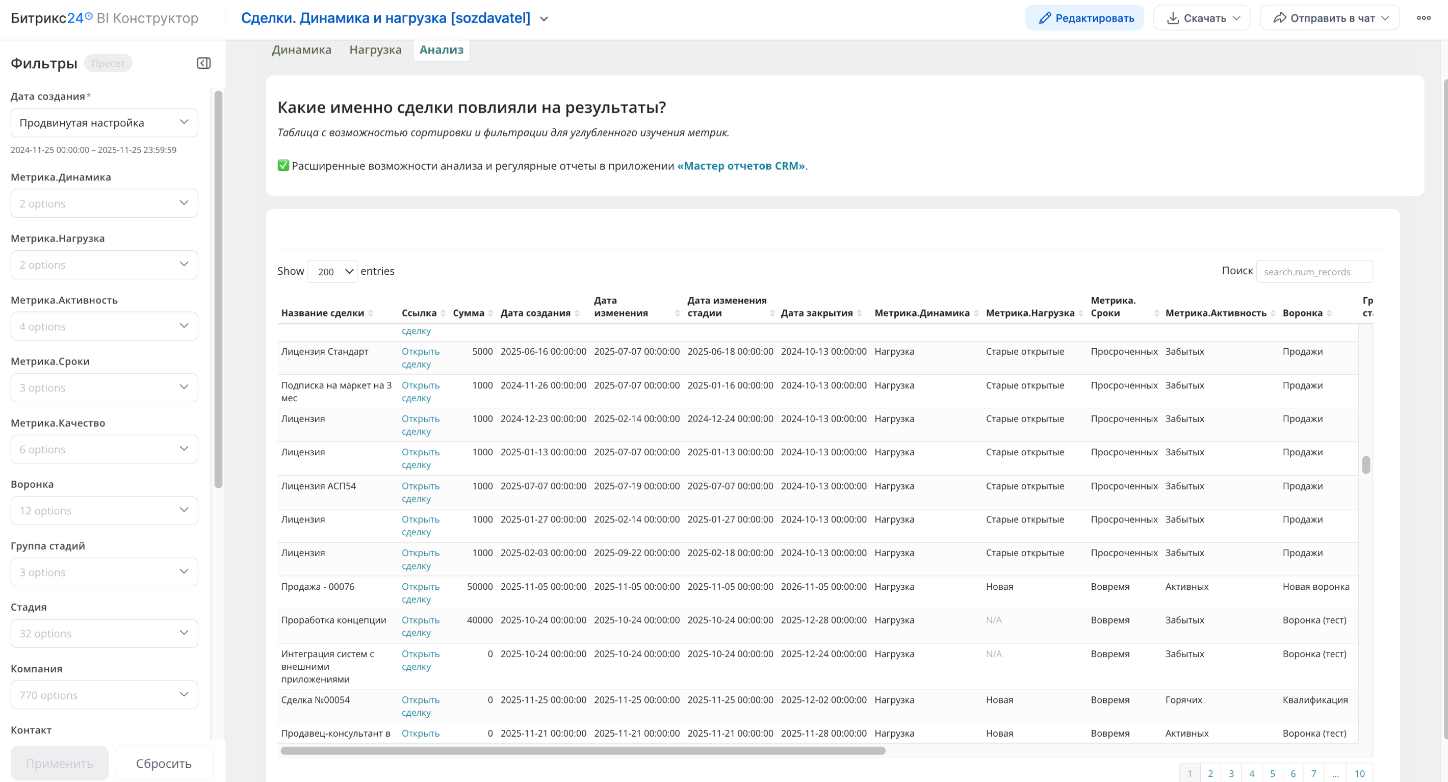 Вкладка «Анализ» представляет собой таблицу с полным списком сделок. Она позволяет сортировать данные, быстро находить нужные строки с помощью поиска, а также переходить по активным ссылкам в сами сделки. Это полезно, когда нужно перейти на следующий уровень детализации.