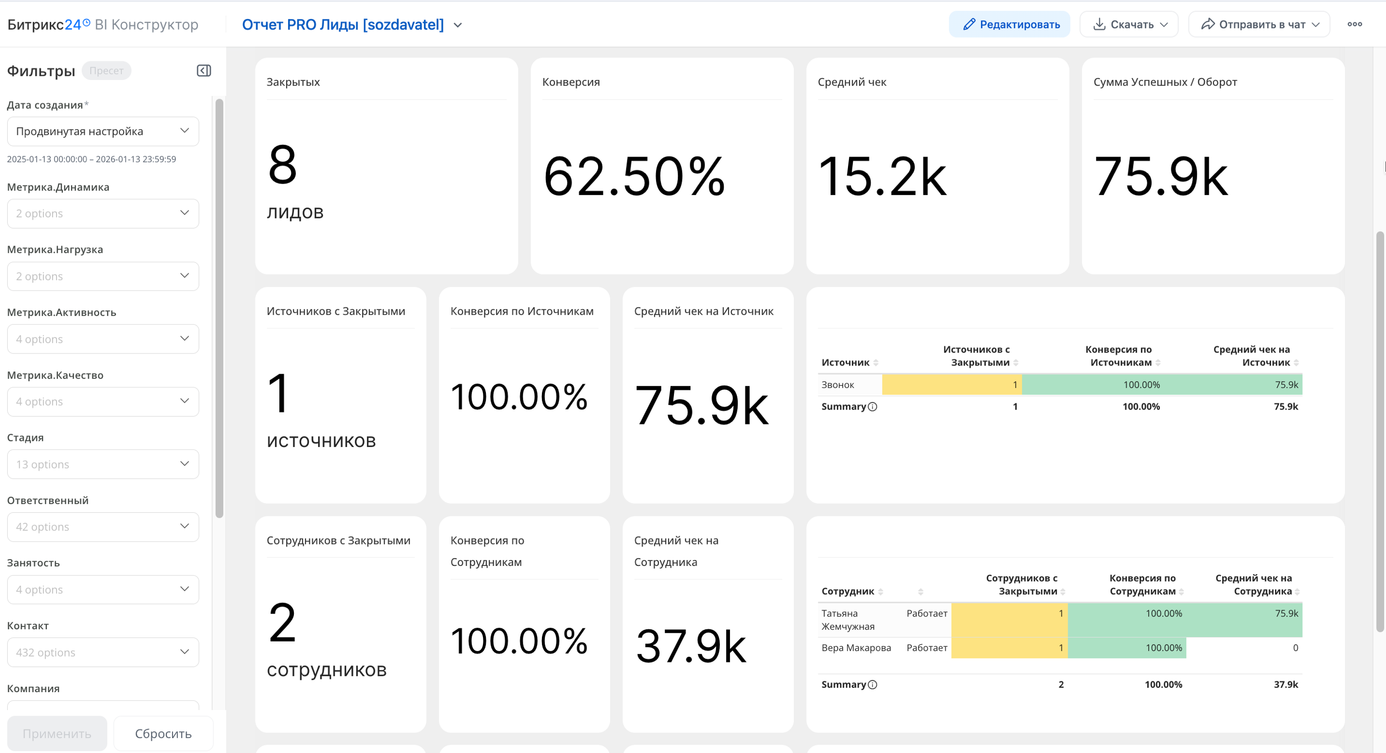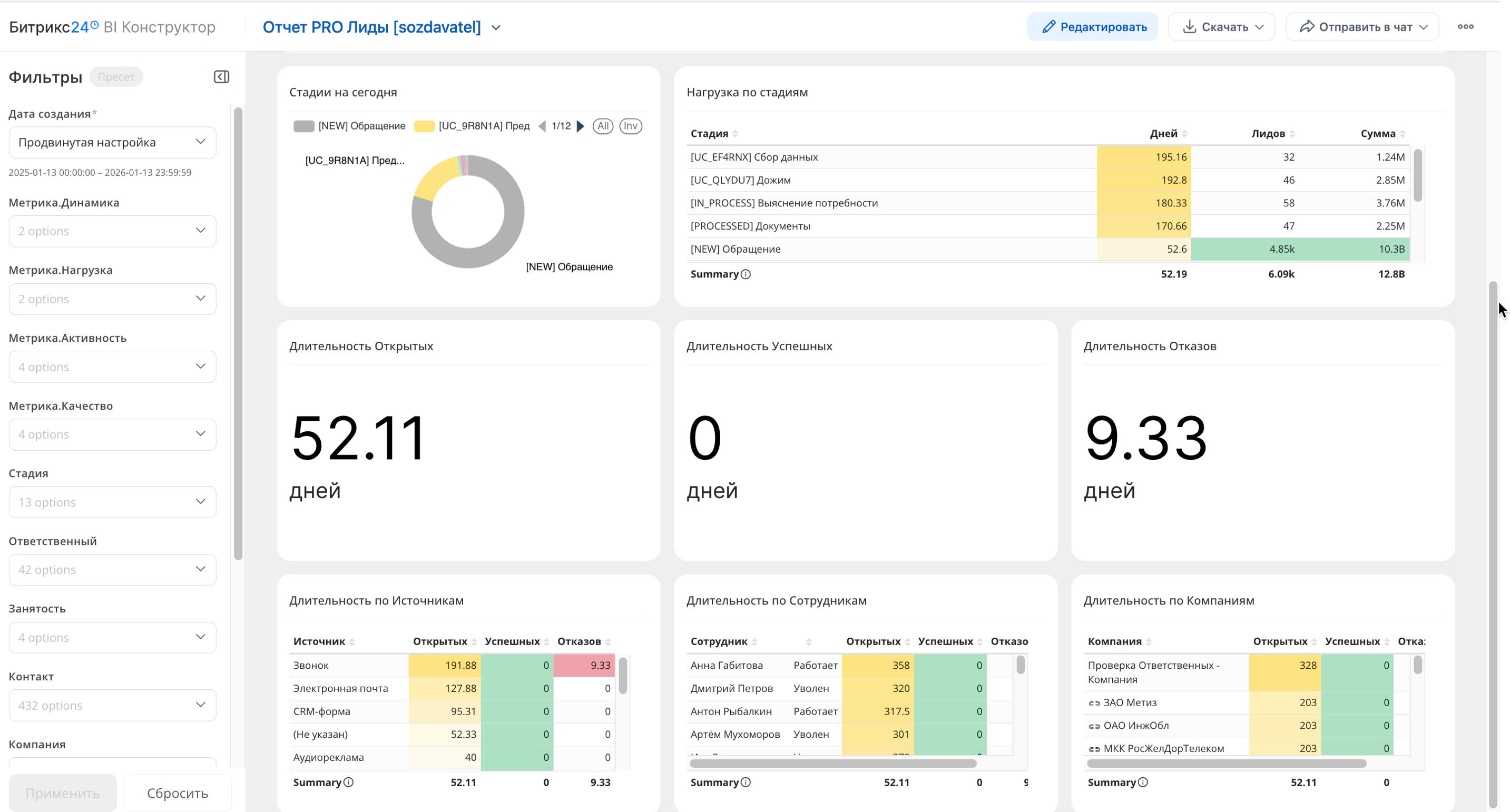 - Скорость: Закрытых успешно — длительность выигранных лидов с момента создания до закрытия.