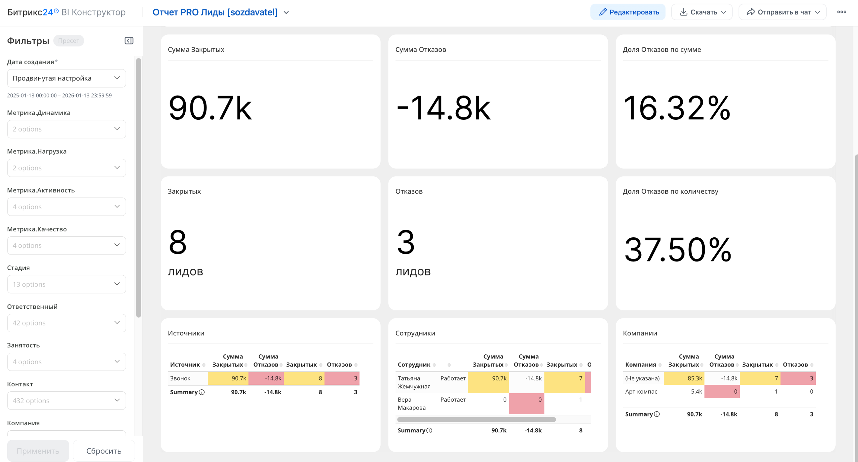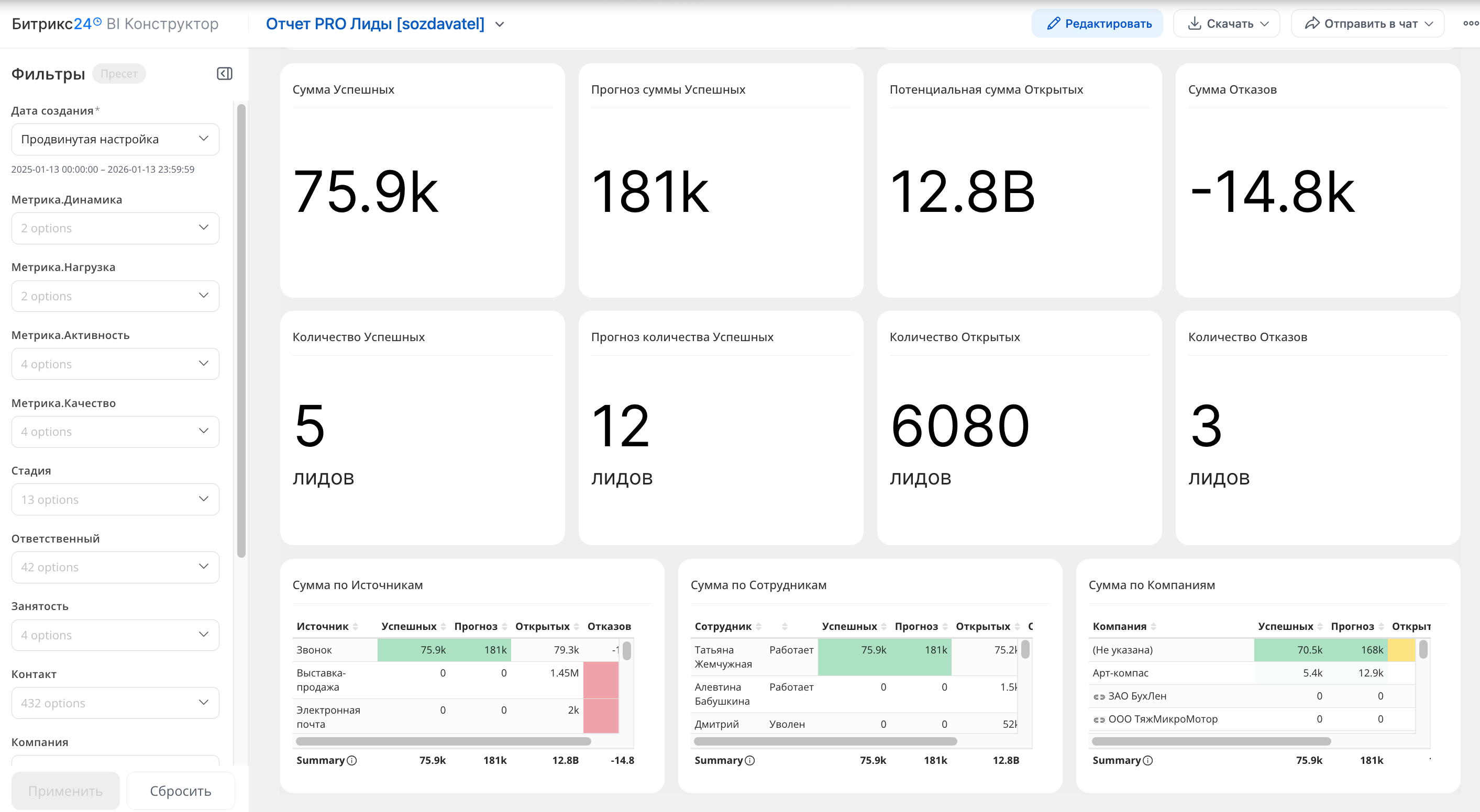 Таблицы по источникам, сотрудникам и компаниям помогают выявить причины потерь и слабые этапы цикла.