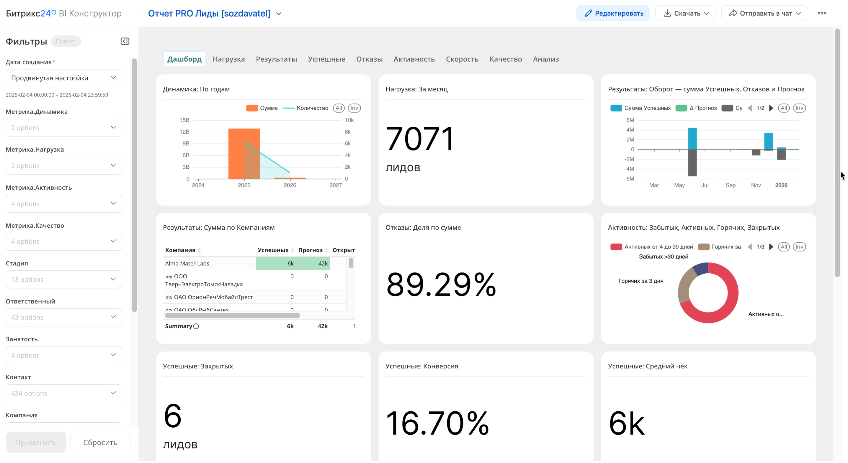 Отчёт PRO Лиды — это комплексный BI-отчёт для руководителя, который помогает быстро оценивать динамику, нагрузку, активность и качество обработки лидов.