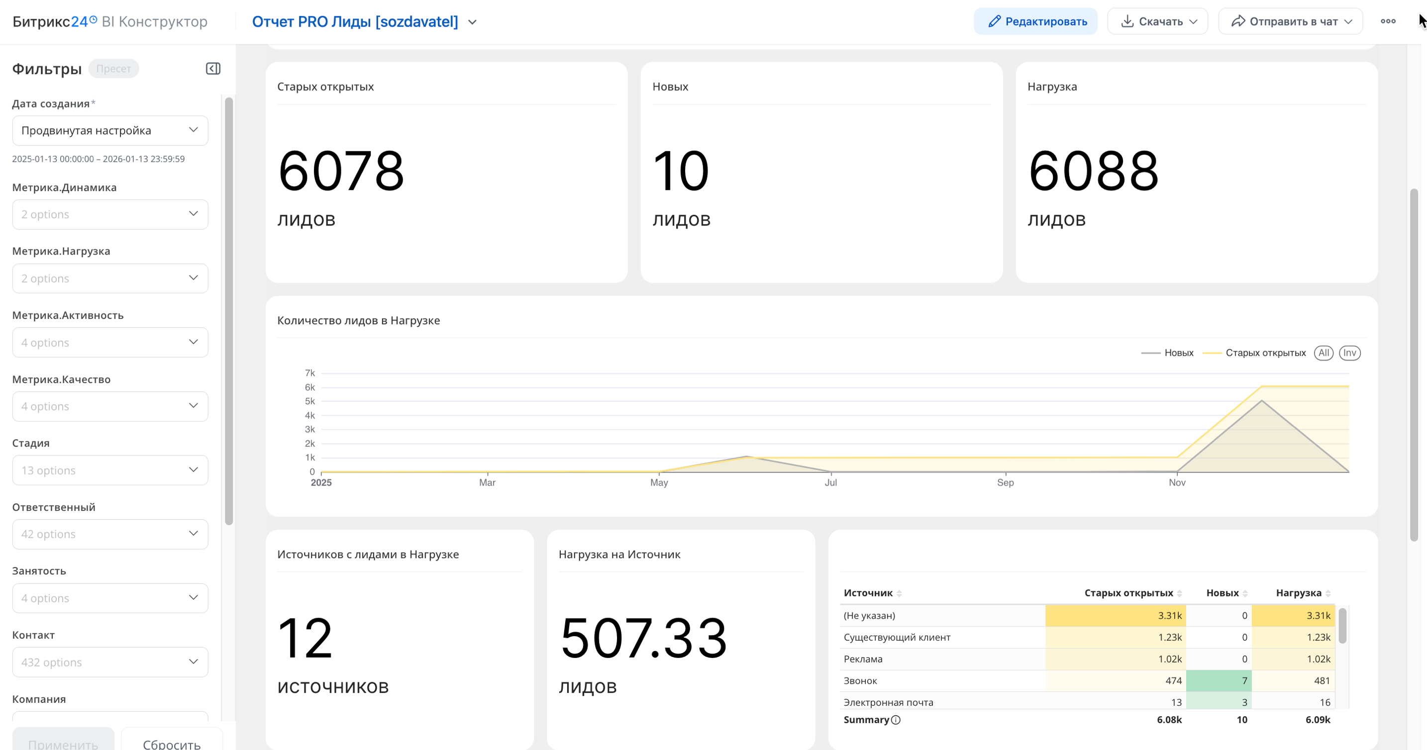 Отвечает на вопрос: сколько лидов сейчас в работе и из чего складывается текущий объём? Лиды из Нагрузки разделяются на Старые открытые (создано до начала текущего месяца и не закрыто на начало этого же месяца) и Новые (создано в этом месяце).
