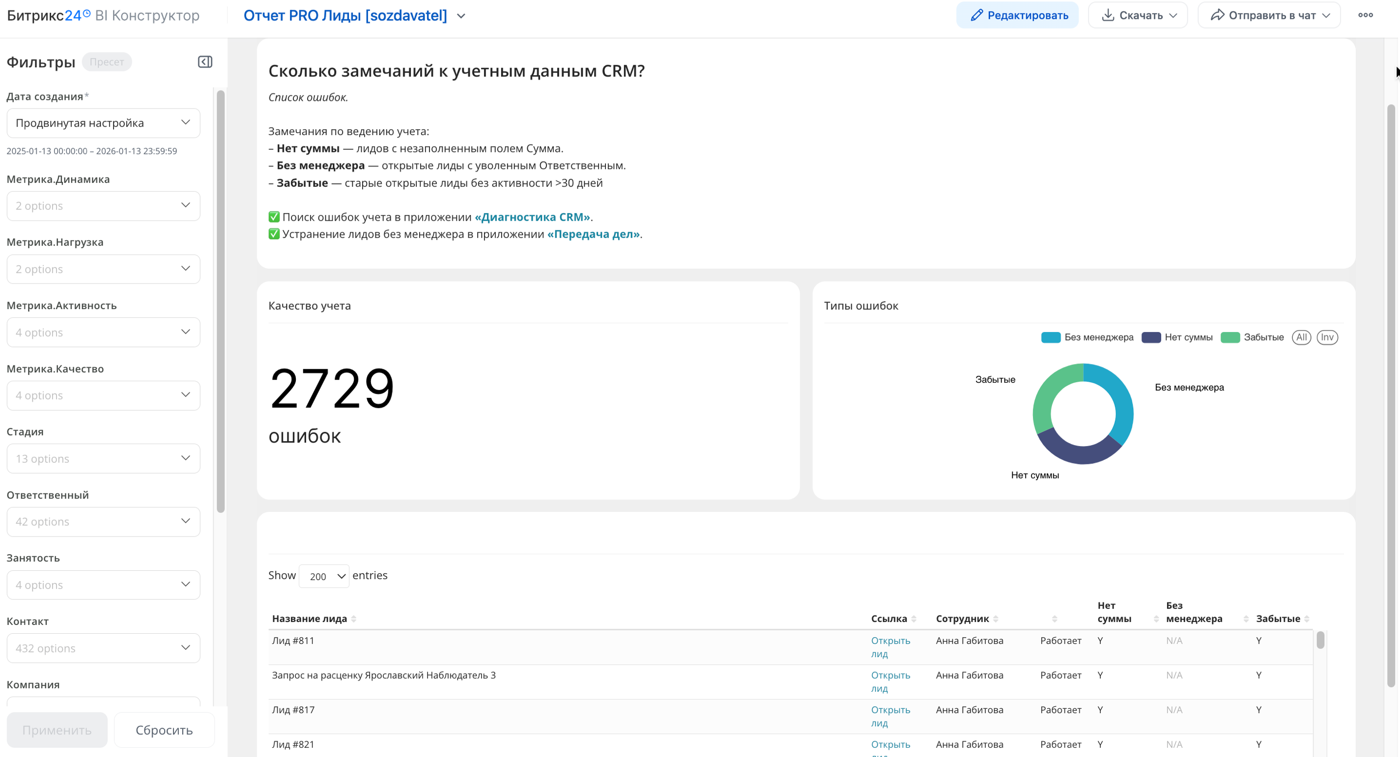 - Качество: Ошибок — общее количество любых ошибок в лидах: без сумм, забытые или без менеджера.