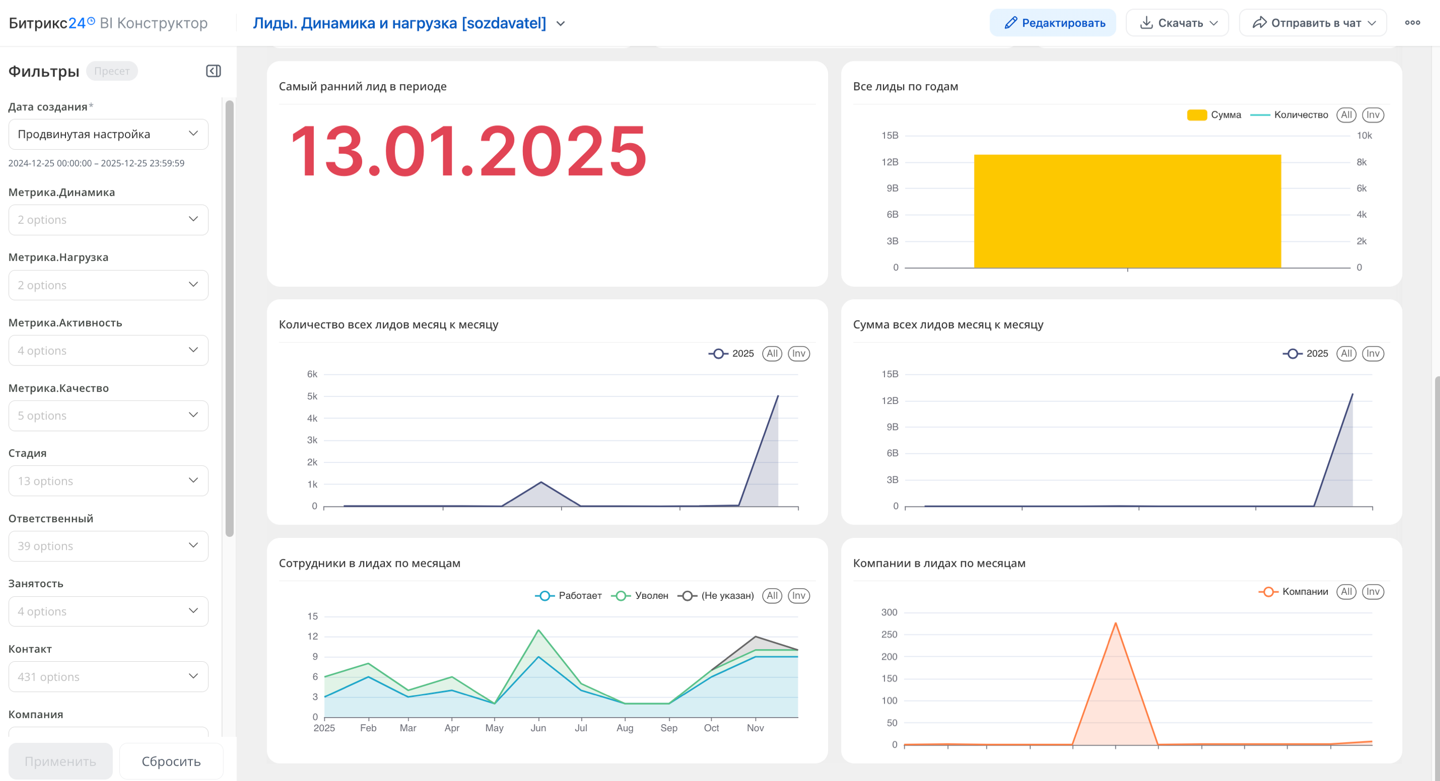 По умолчанию в отчёте отображаются лиды, созданные за последний год. Для получения полной картины рекомендуется установить фильтр с даты создания портала.