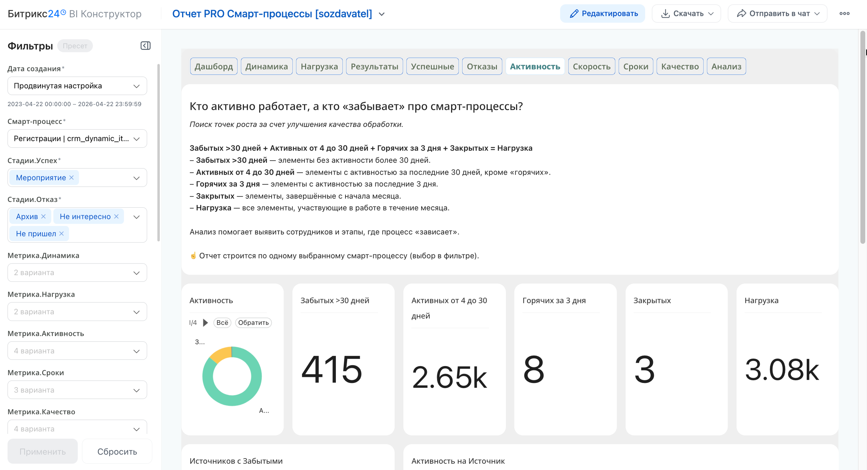 - метрикам Активности (Активные / Горячие / Забытые / Закрытые);