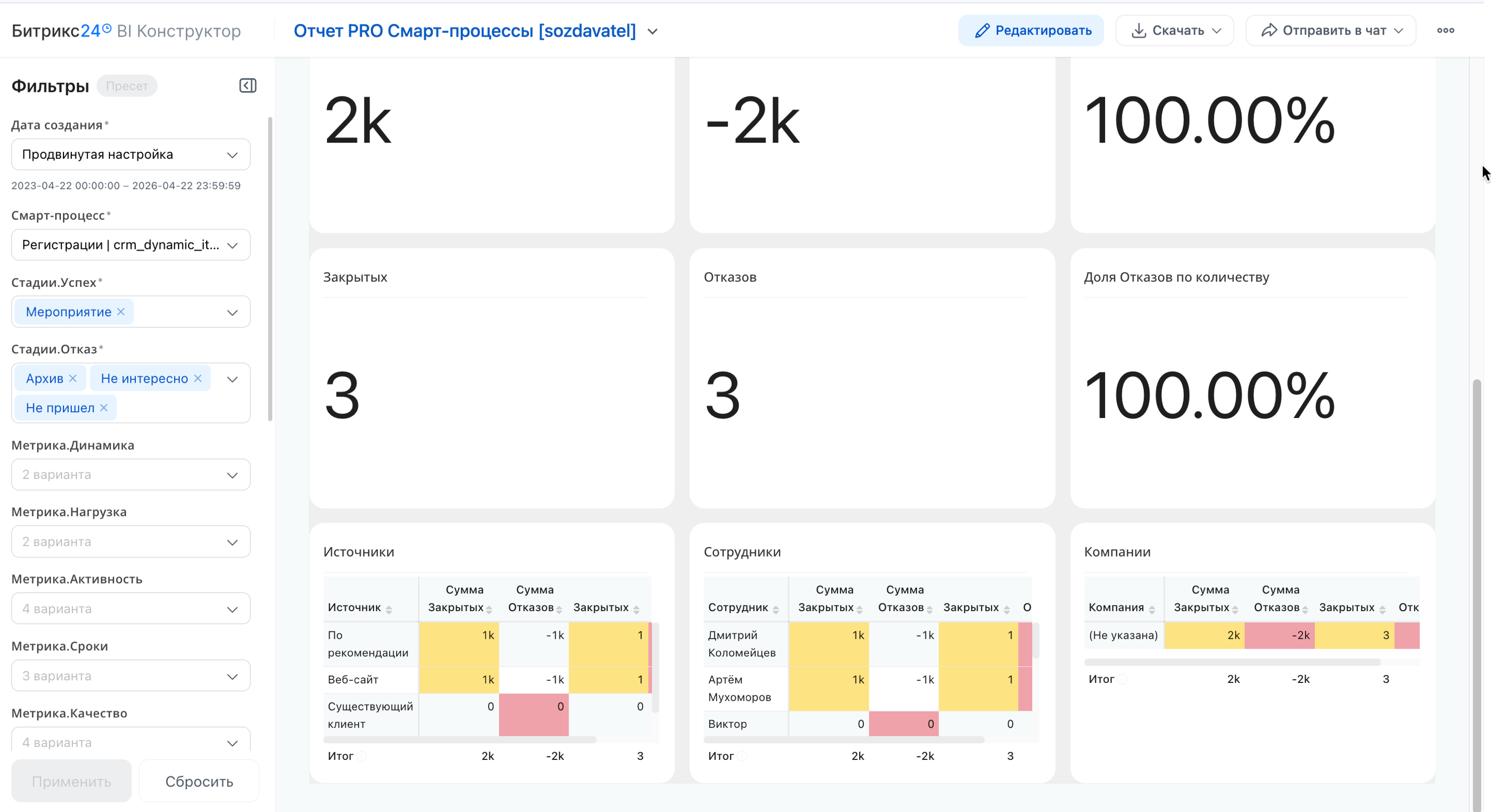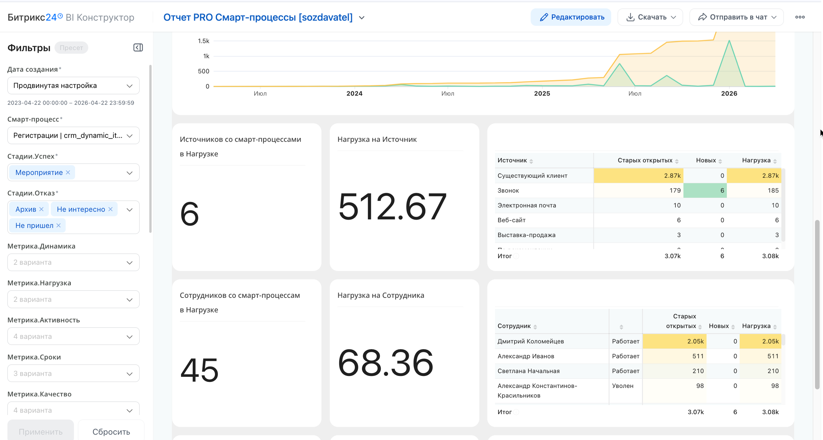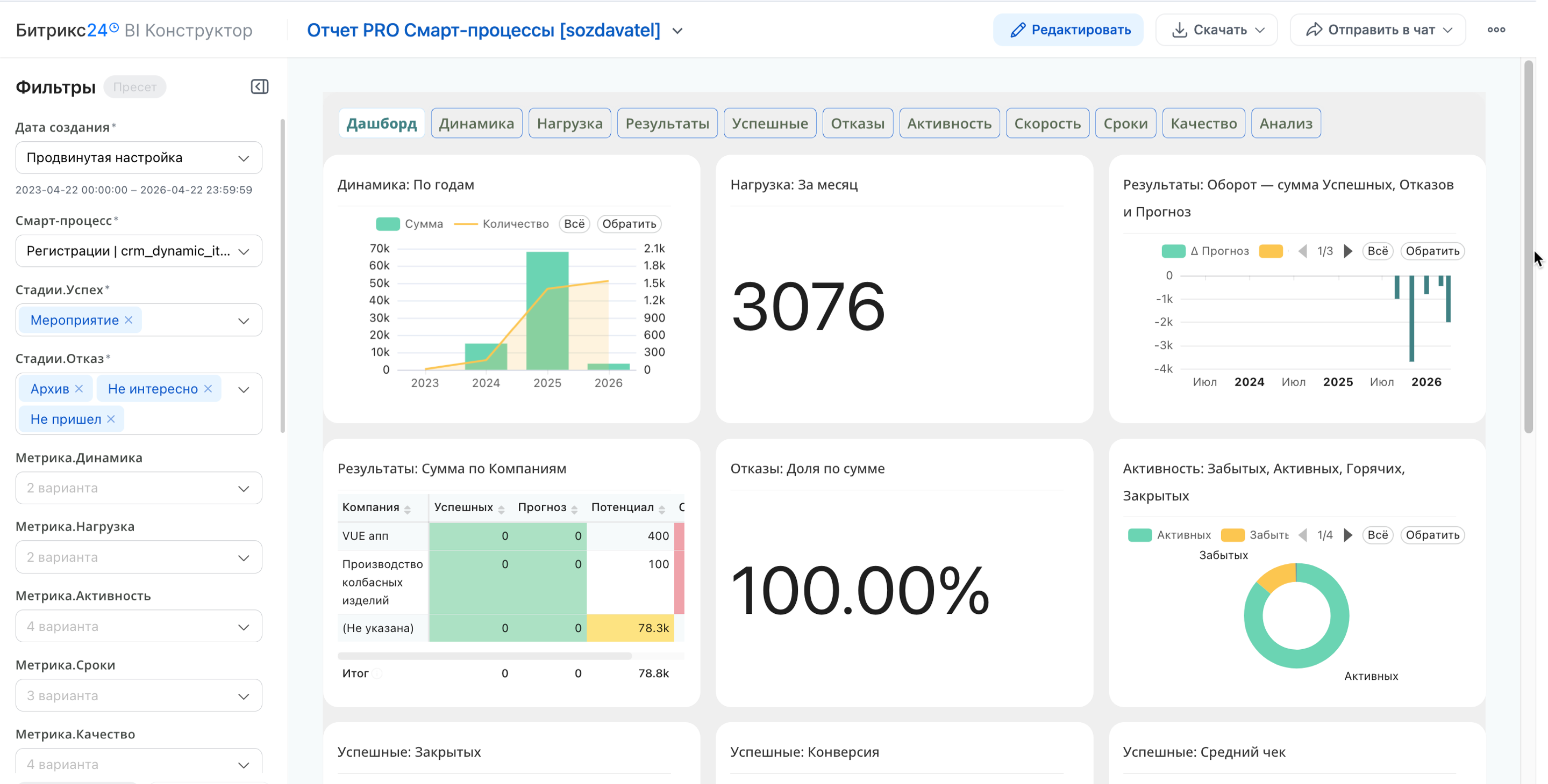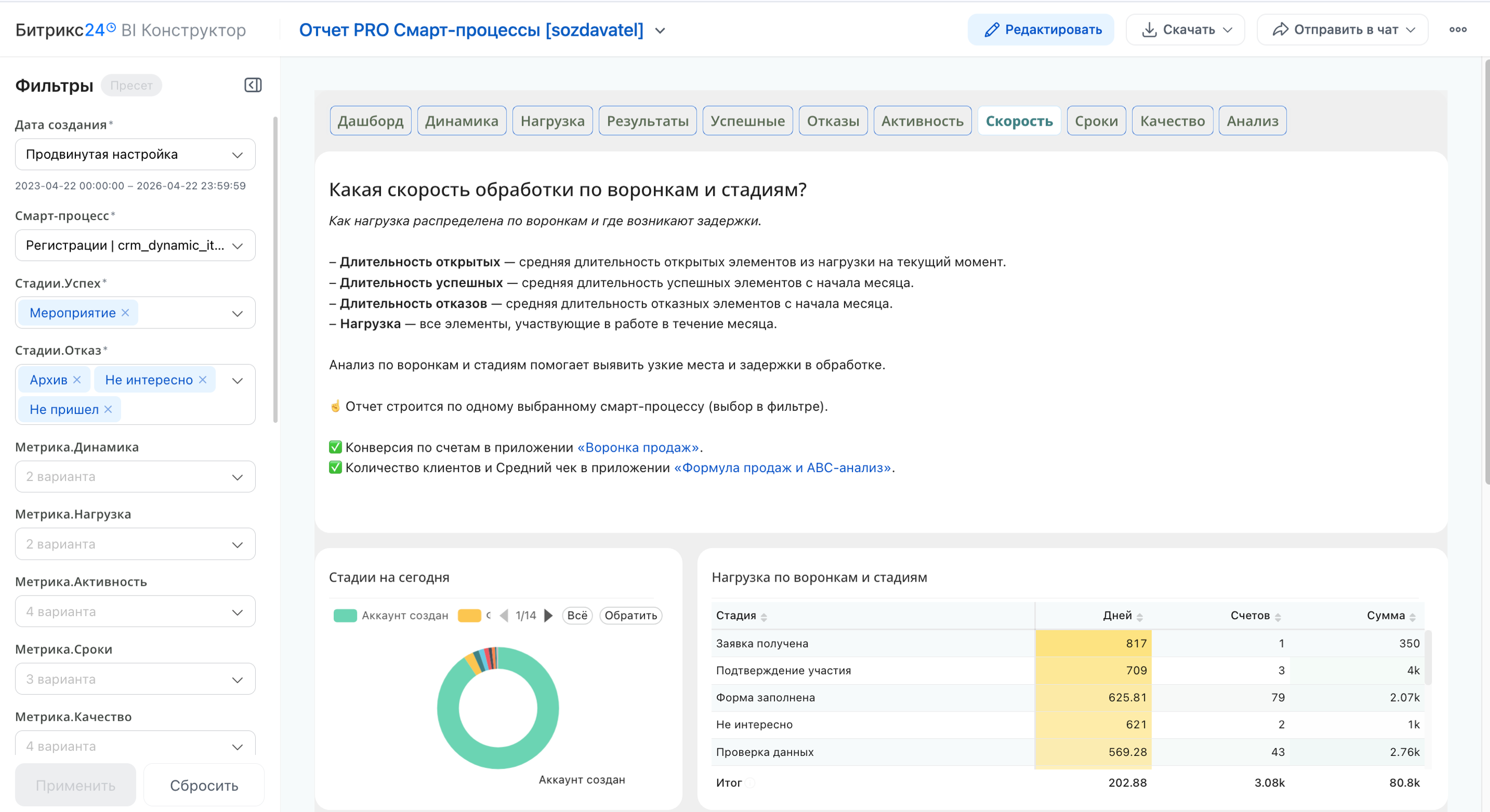 Отчёт PRO Смарт-процессы — это инструмент, который поможет быстро оценить загрузку, результаты и качество работы. В одном отчёте собраны ключевые показатели: скорость, конверсия, суммы, причины отказов и распределение нагрузки.