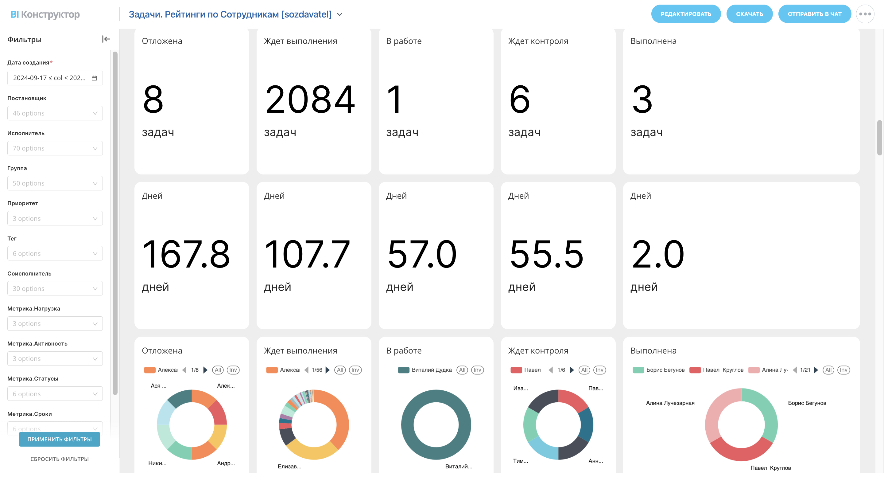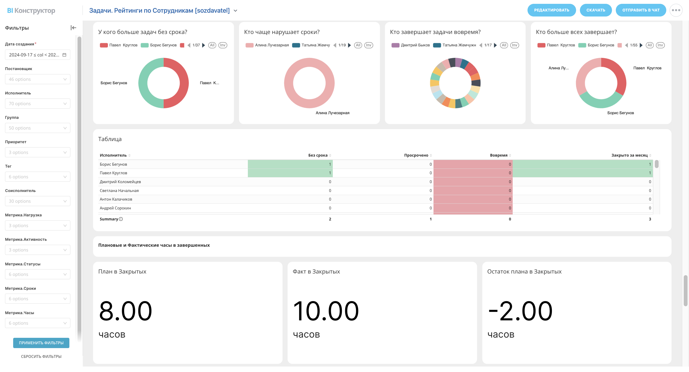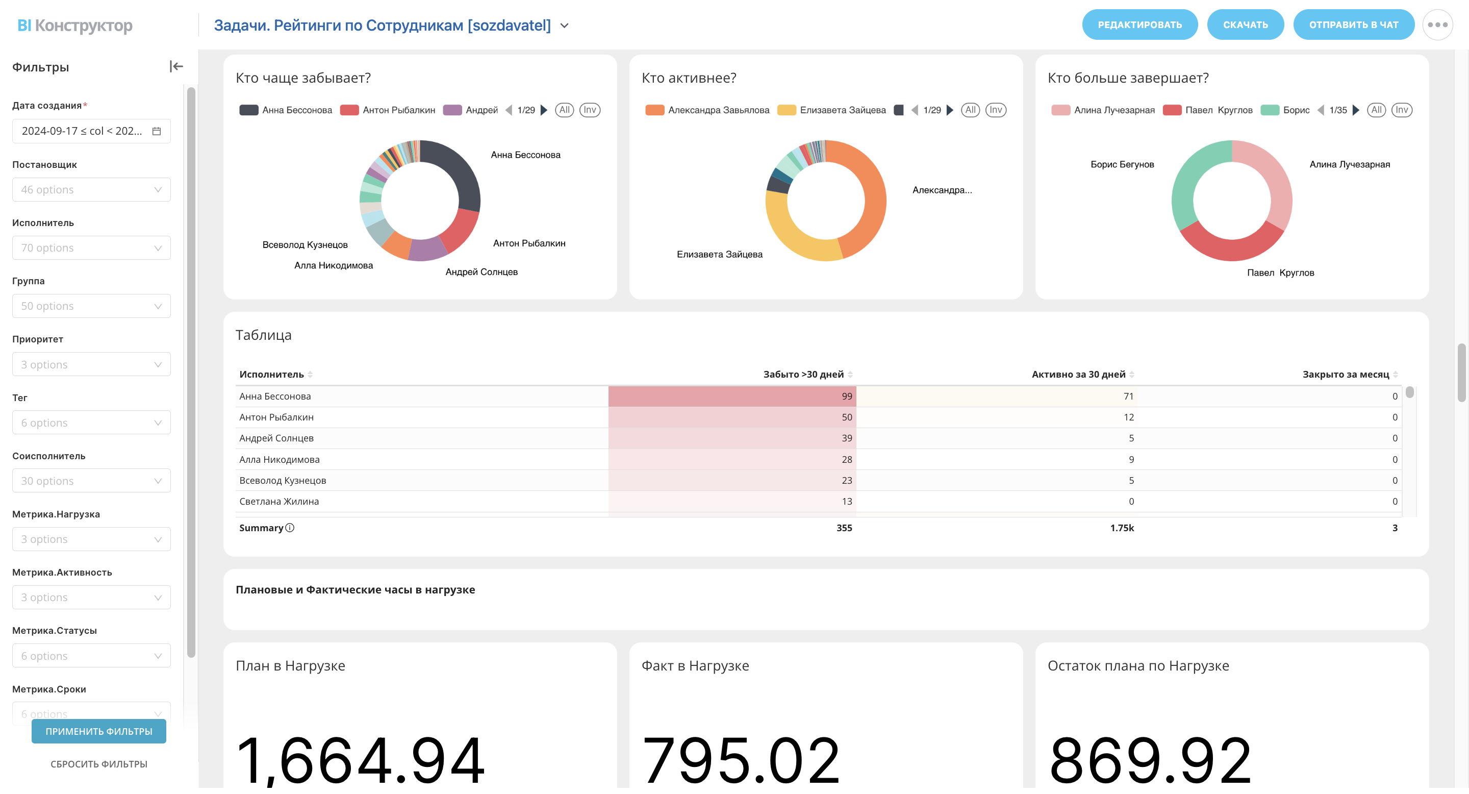 Диаграммы и таблицы показывают, кто чаще забывает о задачах, кто активно работает и кто закрывает больше всего задач.