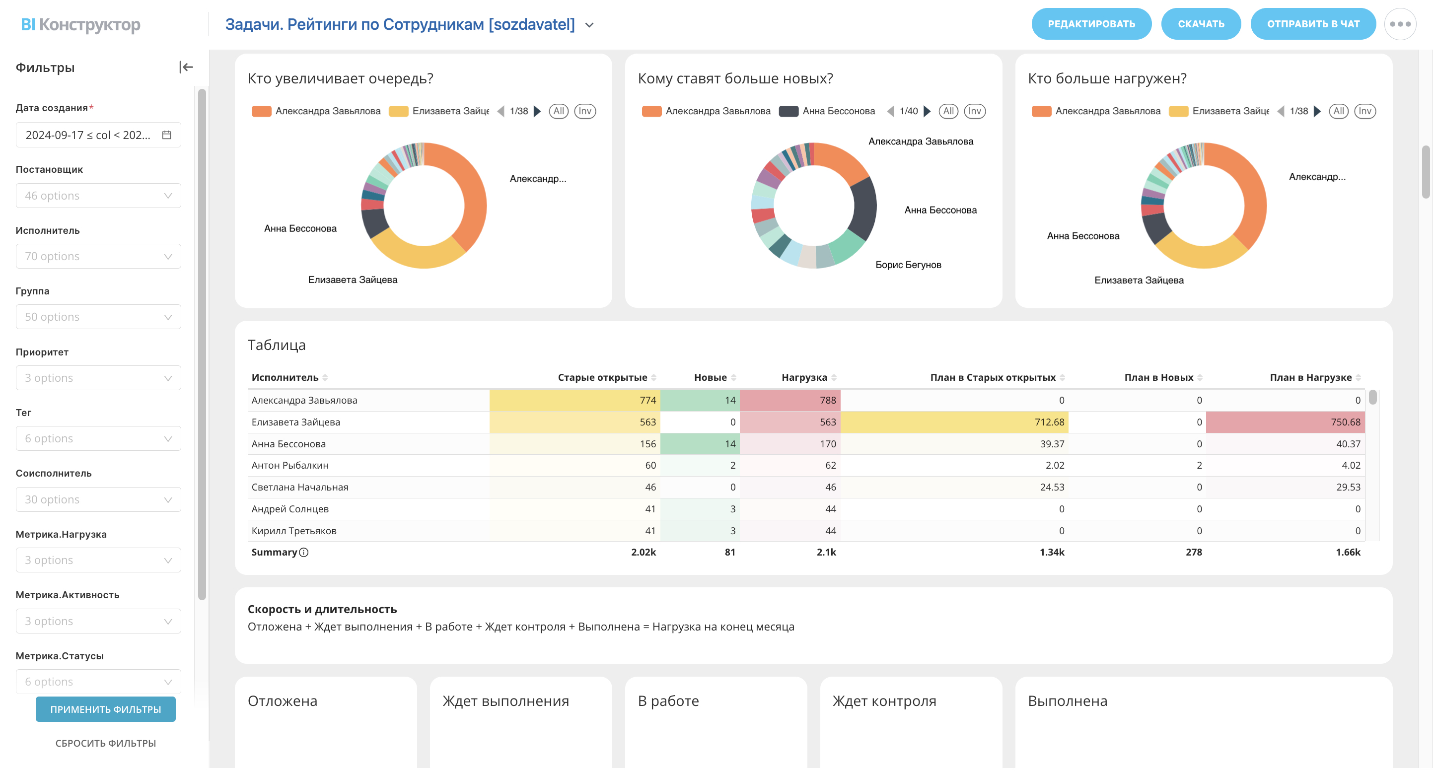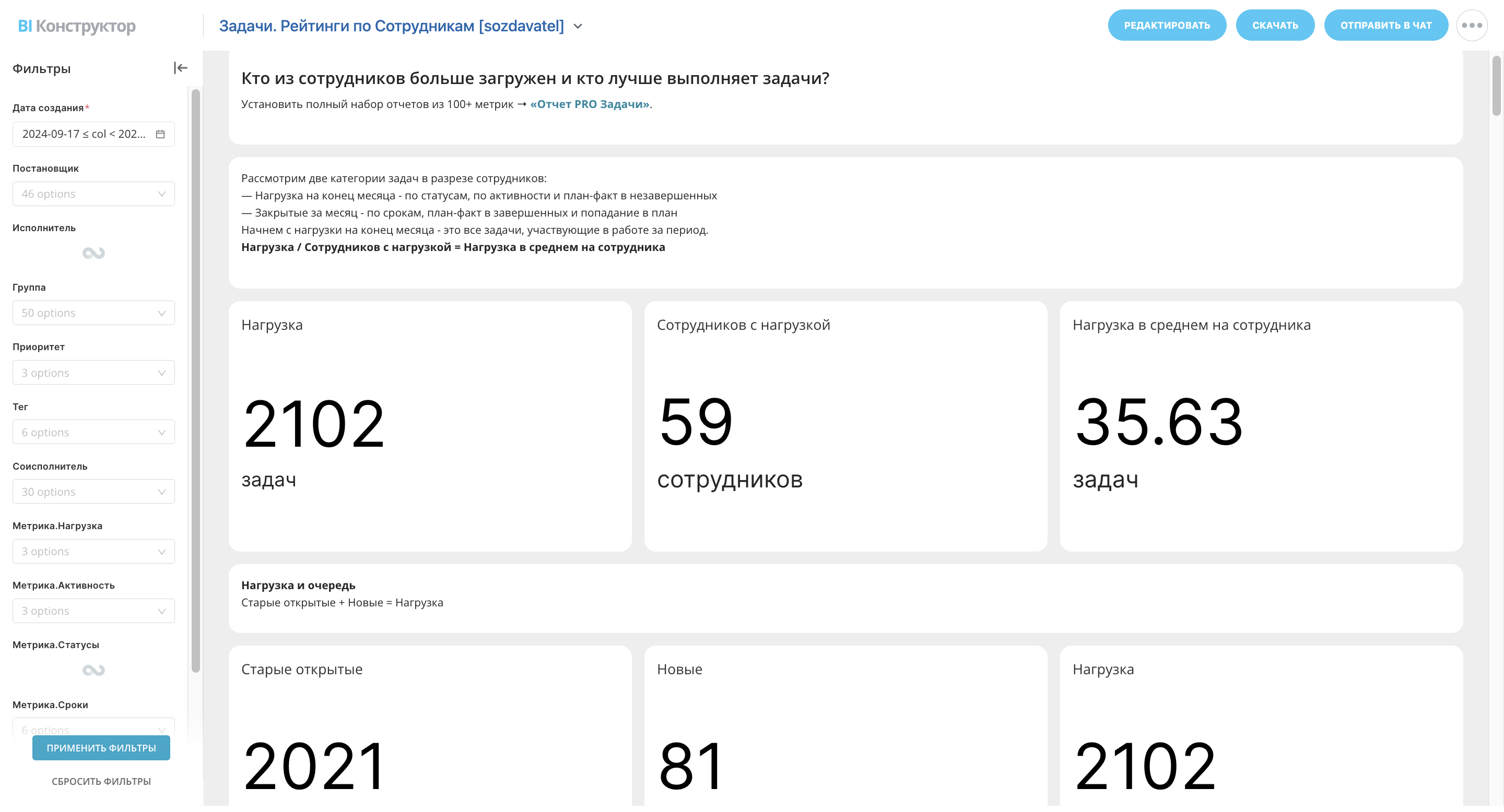 Нагрузка — сумма старых открытых задач и новых, созданных за текущий месяц. Сотрудники с нагрузкой — те исполнители, у которых были задачи в работе за это время. А Нагрузка в среднем, на сотрудника — количество задач на одного ответственного.