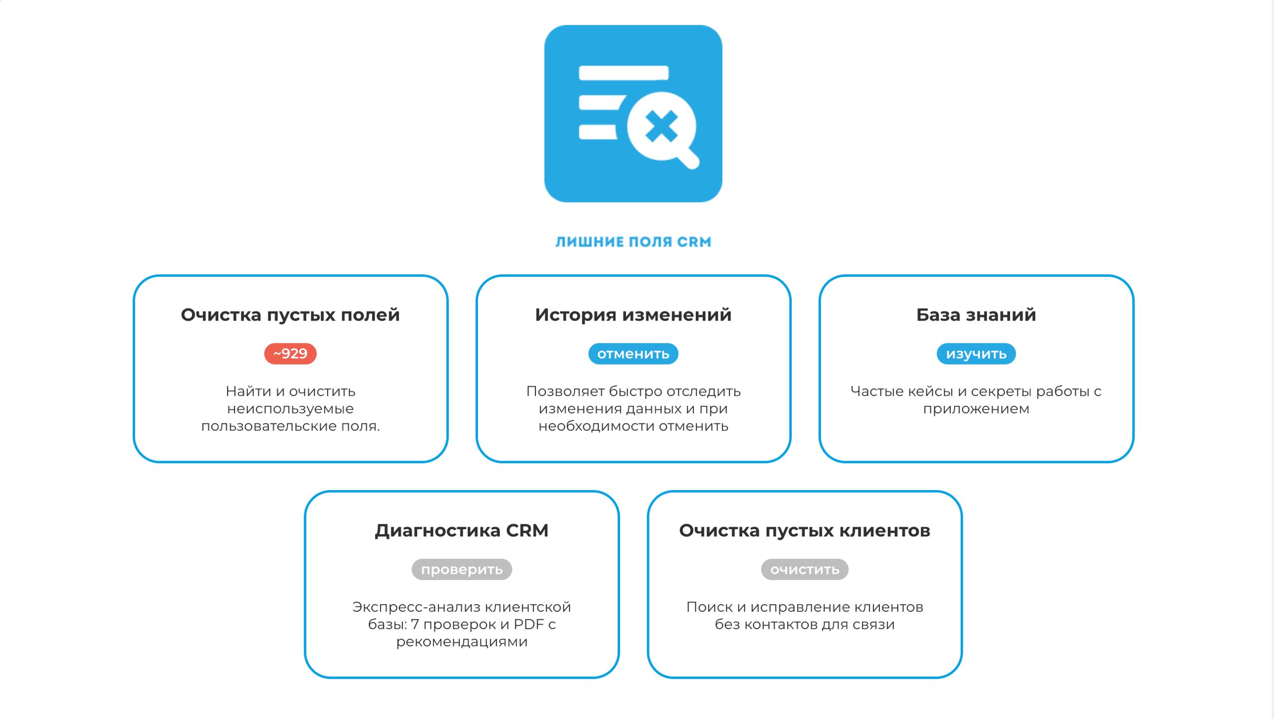 Приложение анализирует каждое пользовательское поле вне зависимости от стадии сущностей или её даты создания, поэтому вы получаете полную картину — без «слепых зон» и пропущенных данных.