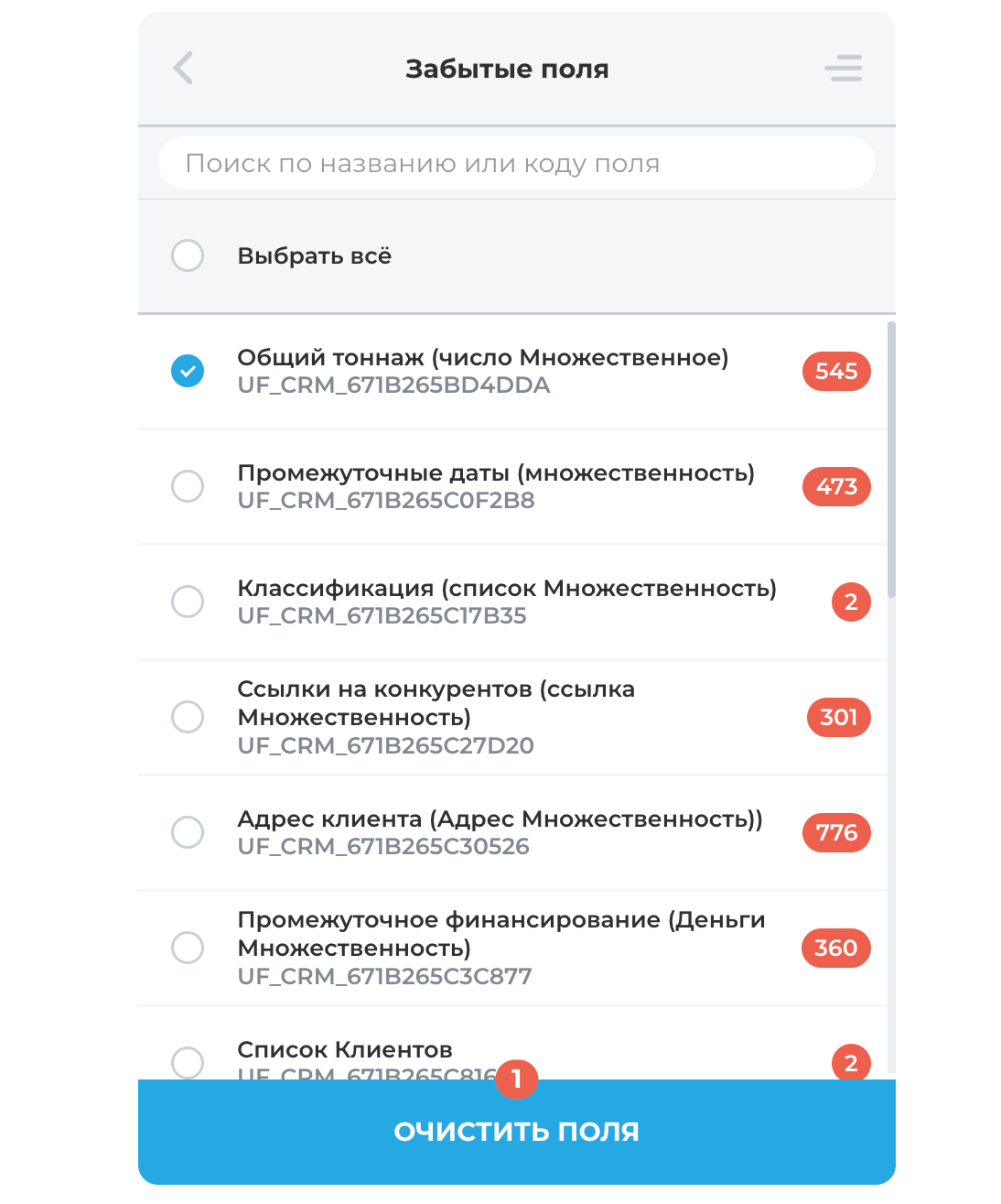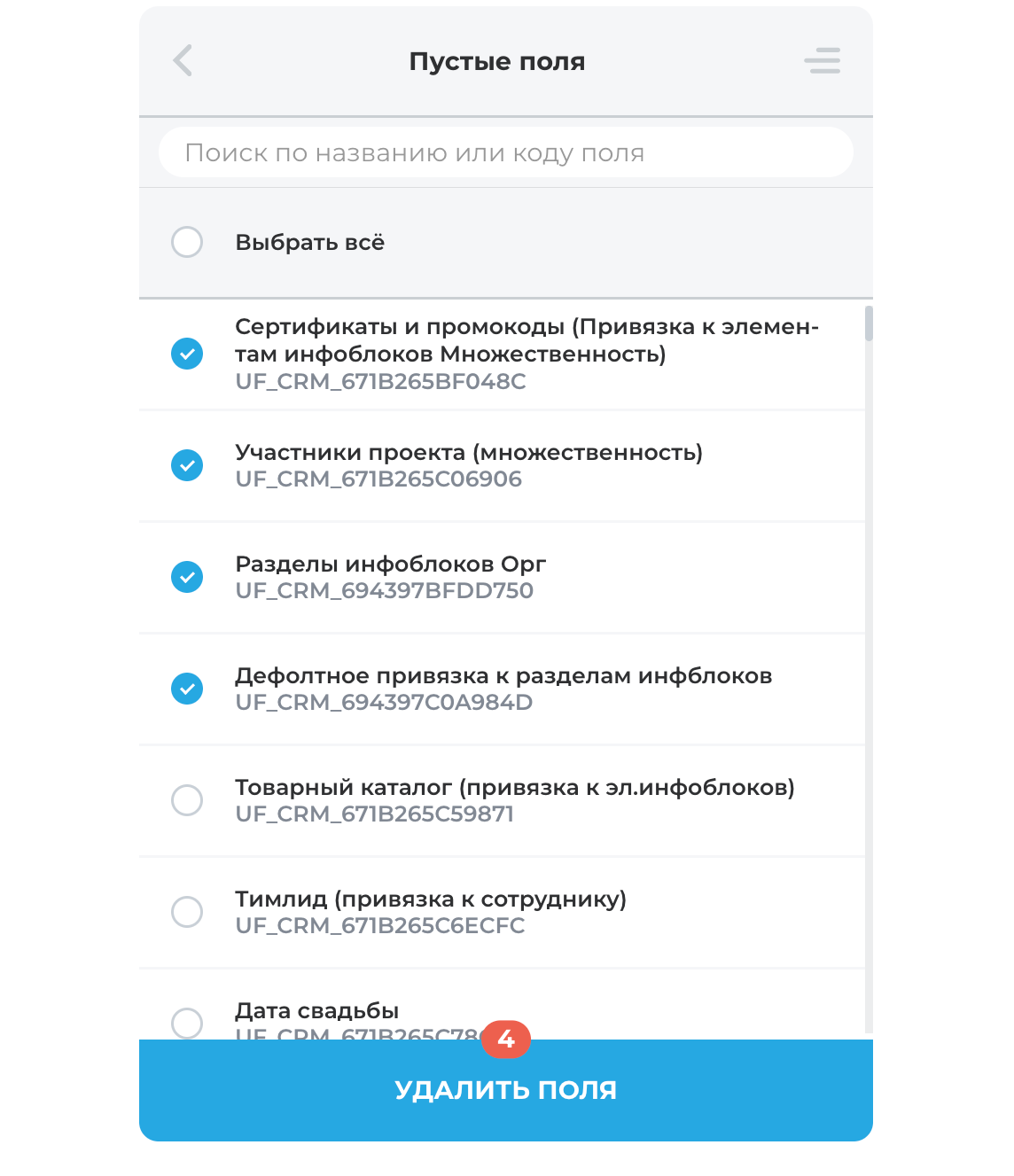 Вся информация о полях отображается в удобном формате: название и символьный код. Чтобы быстро находить нужное, можно воспользоваться поиском — достаточно ввести часть названия или кода. Приложение показывает даже скрытые поля, доступные только через Rest API.