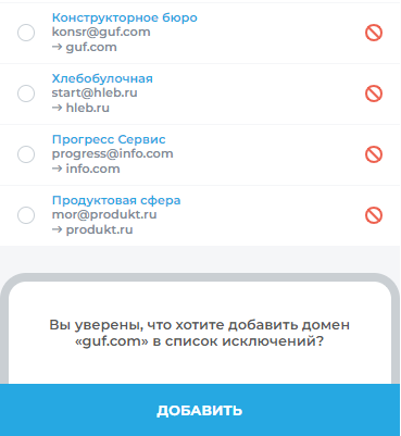 А также История изменений и Список исключений почтовых доменов. В каждом из режимов есть поиск по доступным полям. Групповой выбор одинаковых элементов (NEW) позволит, например, выбрать все Контакты и Компании с одинаковым телефоном и связать их между собой.