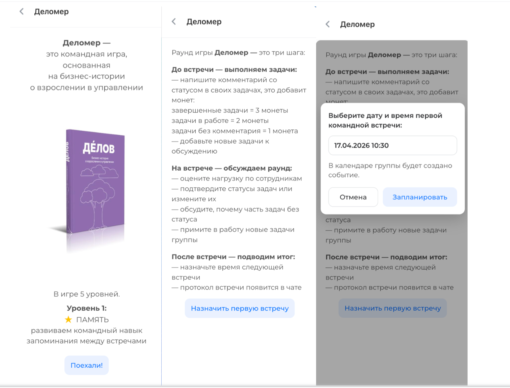 Деломер — управленческая игра для регулярных рабочих встреч в Битрикс24. Превращает обычные обсуждения в структурированные управленческие раунды, где фиксируются решения, проверяется результат и сохраняется история действий. Часть методологии «Все Дела».