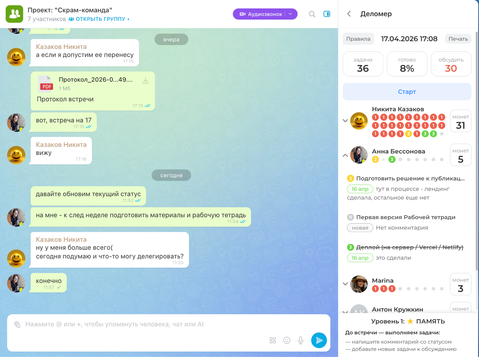 1. Чат группы — игровое поле. Задачи — протокол встречи.