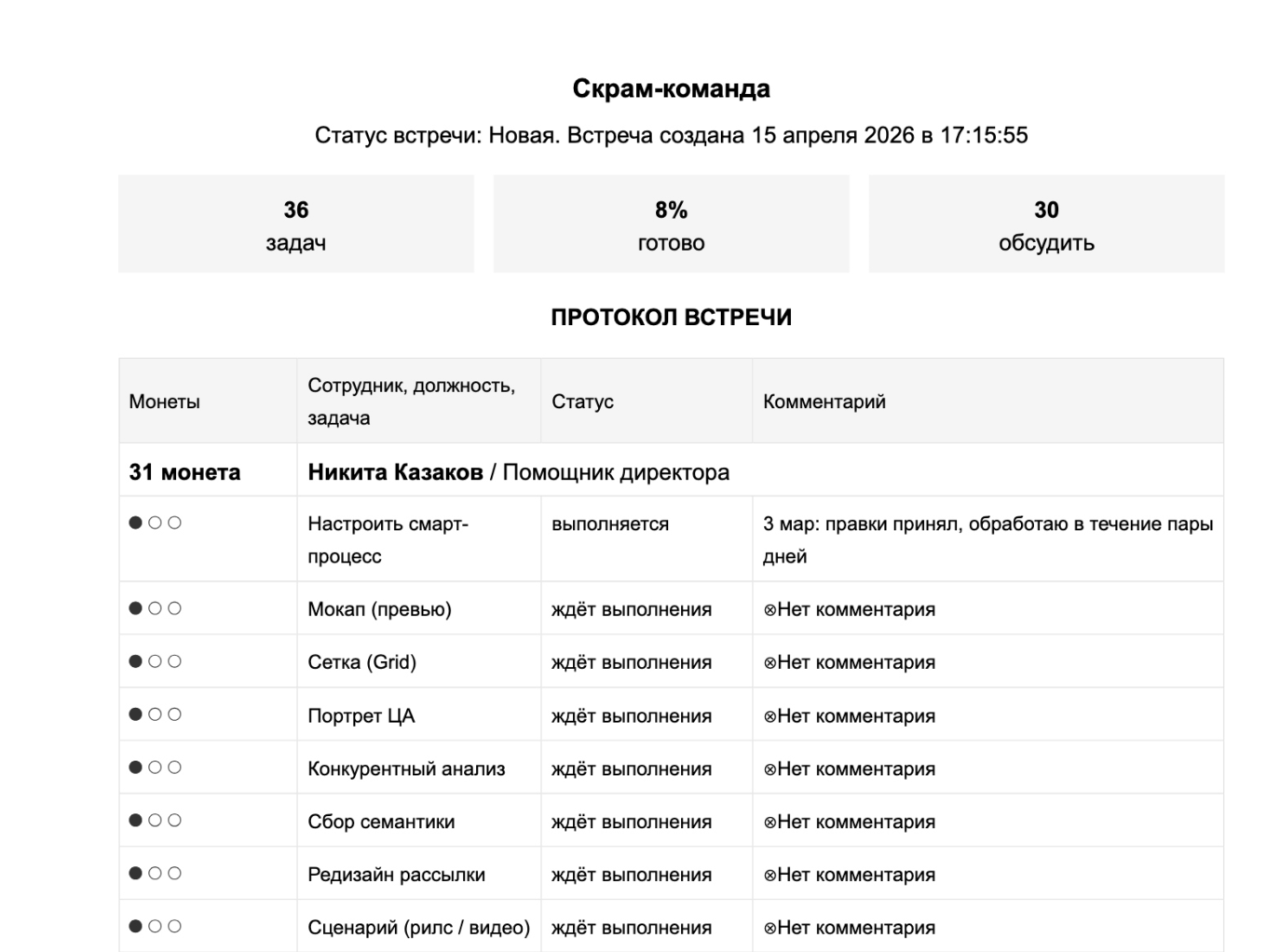- После встречи — назначение следующей встречи и «Протокол встречи» в чате с итогами раунда.