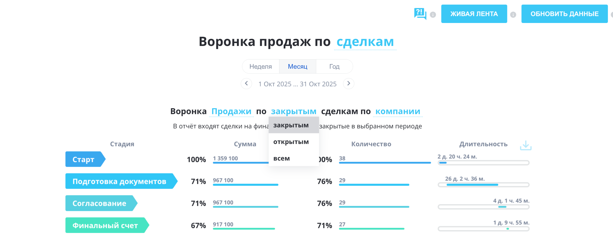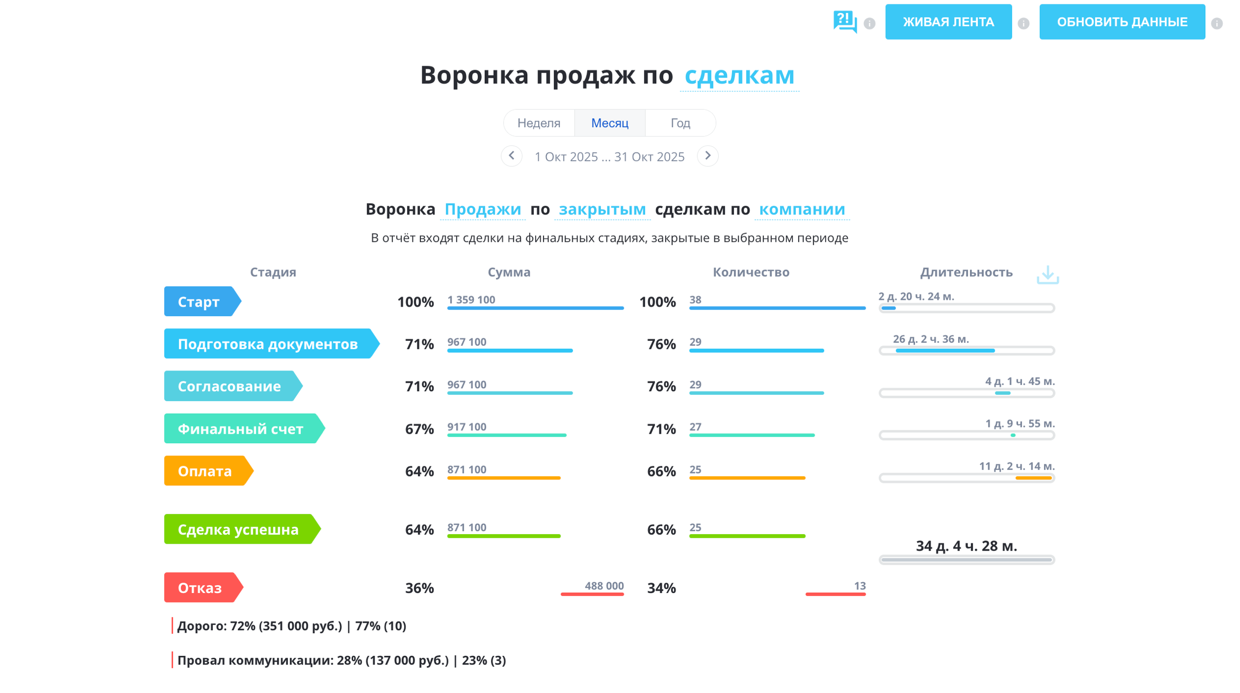 Если сделка находилась на стадии менее минуты, её длительность на ней будет нулевой — как и для успешных сделок, пропустивших какую-либо стадию. Кроме того, учитывается ситуация непоследовательного движения по стадиям. График позволяет выявить стадии с наибольшим количеством отказов и задержек, а также его можно скачать в хорошем качестве для печати.