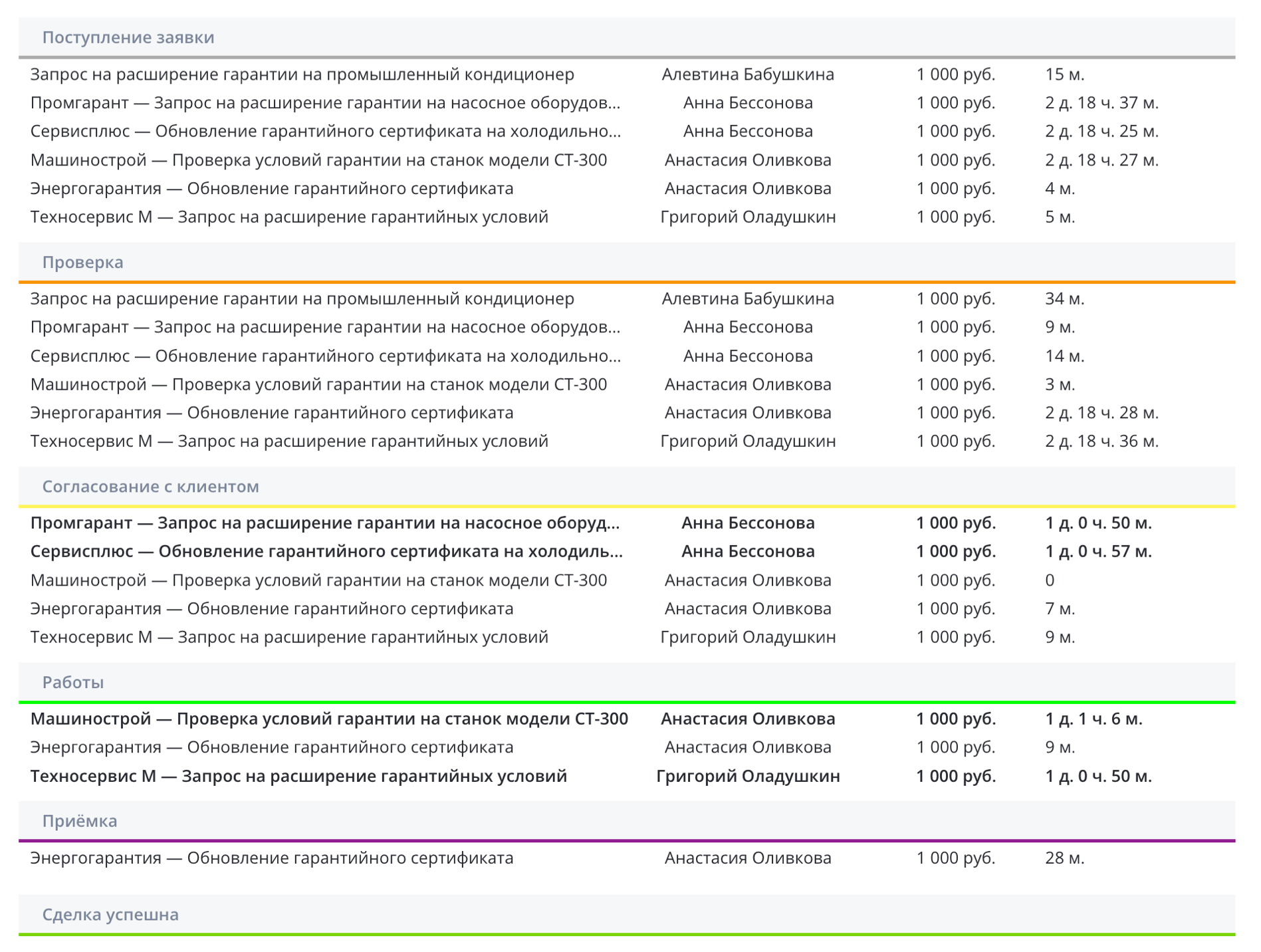 Под графиком находится таблица с детализацией по стадиям — для того, чтобы можно было убедиться в достоверности расчетов. В ней указаны: название каждой сделки, ответственный за неё, сумма и время нахождения на конкретной стадии. Те сделки, которые в настоящий момент находятся на стадии – выделены жирным шрифтом.