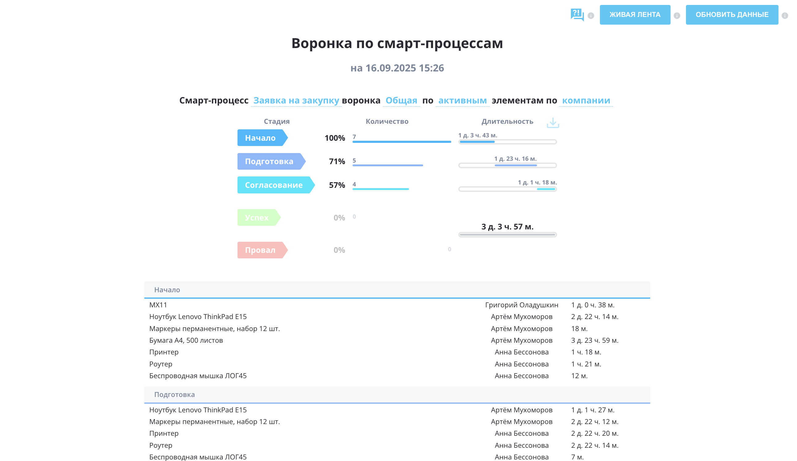 Воронка по смарт-процессам — это инструмент для наглядного анализа конверсии и длительности нахождения элементов на стадиях.