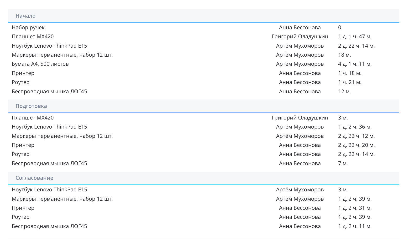 Под графиком находится таблица с детализацией — для того, чтобы можно было убедиться в достоверности расчетов. В ней отображается название каждого элемента, ответственный за него, сумма и длительность нахождения на стадии.