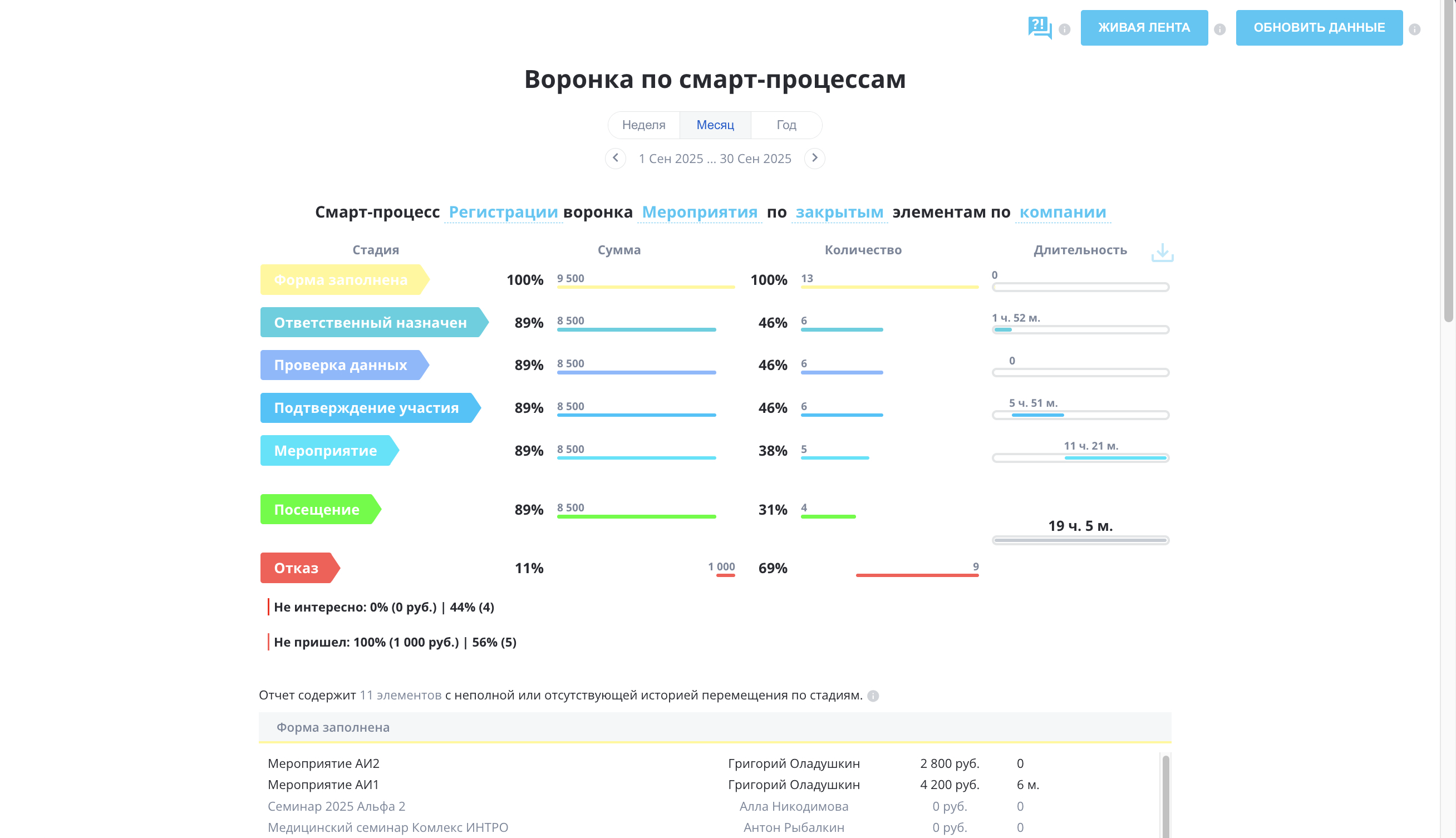 Если успешный элемент пропустил какой-то этап – он будет учитываться в его показателях по конверсии, сумме и количеству, но в длительности на пропущенной стадии будет «0». Аналогично для элементов, находившихся на стадии менее минуты. При этом они будут включены в расчёт средней длительности.