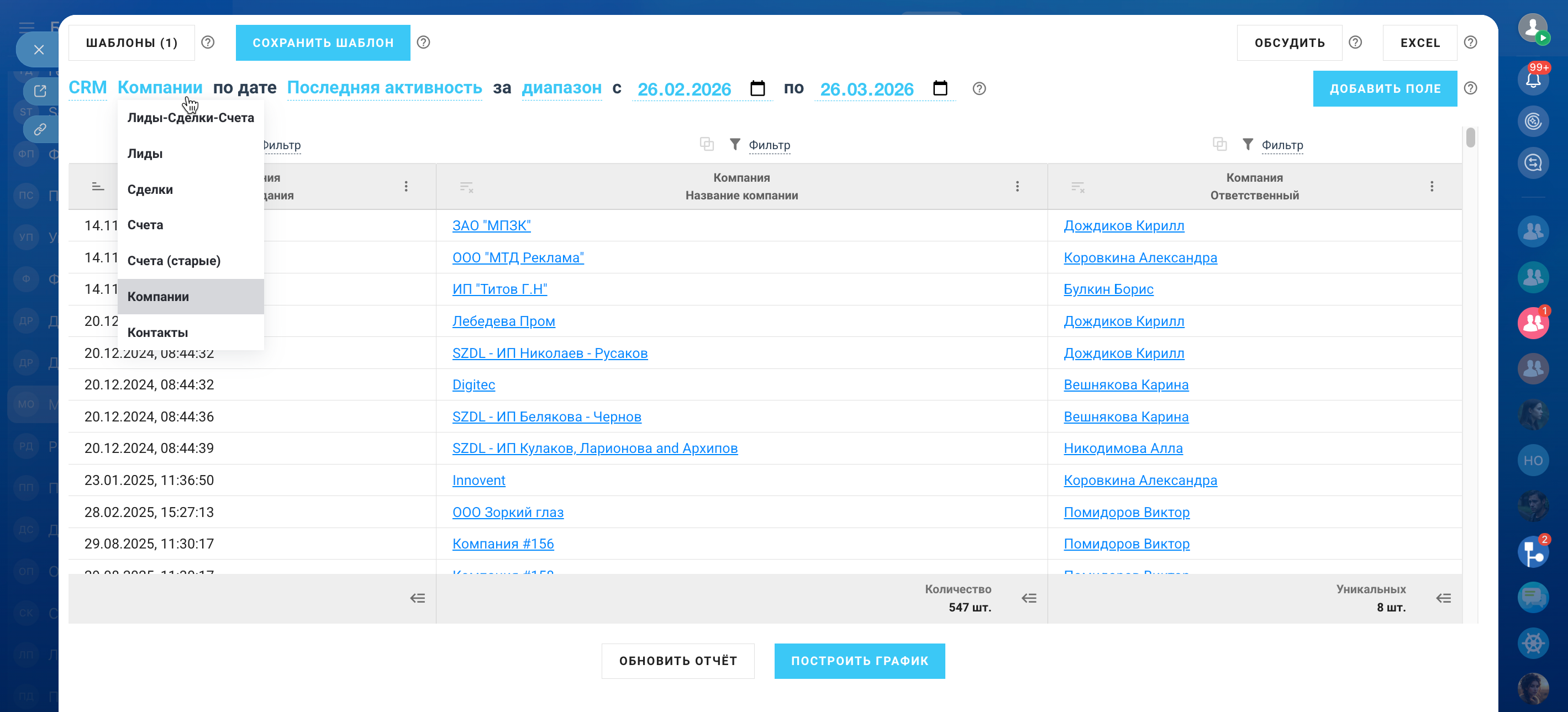 6 отдельных режимов: Лиды, Сделки, Счета, Счета (старые), а также Контакты и Компании (NEW) позволяют менять дату, по которой будет происходить выборка данных. Например, выбрать все Компании по дате последней активности текущего месяца.