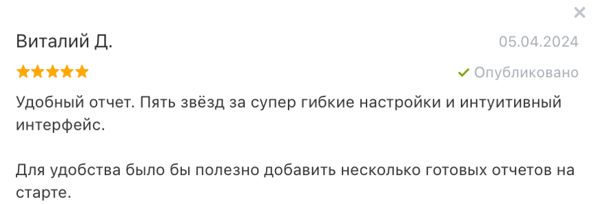 - Сохранять отчёты в шаблоны и открывать одним кликом.