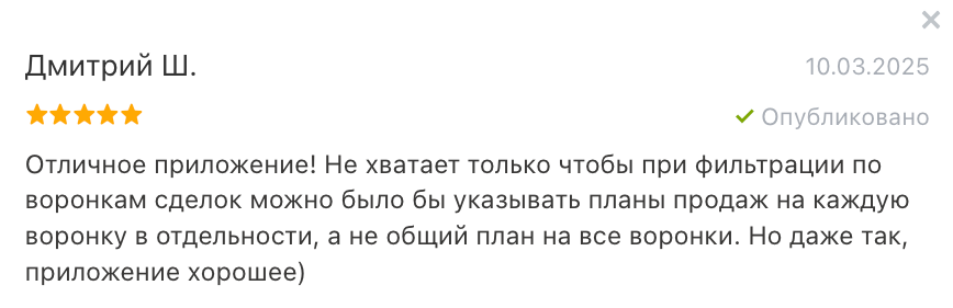 Помимо этого, План продаж встроен в CRM-аналитику, что позволит РОПу проводить изучение и анализ эффективности отдела продаж в совокупности с другими приложениями или отчётами.