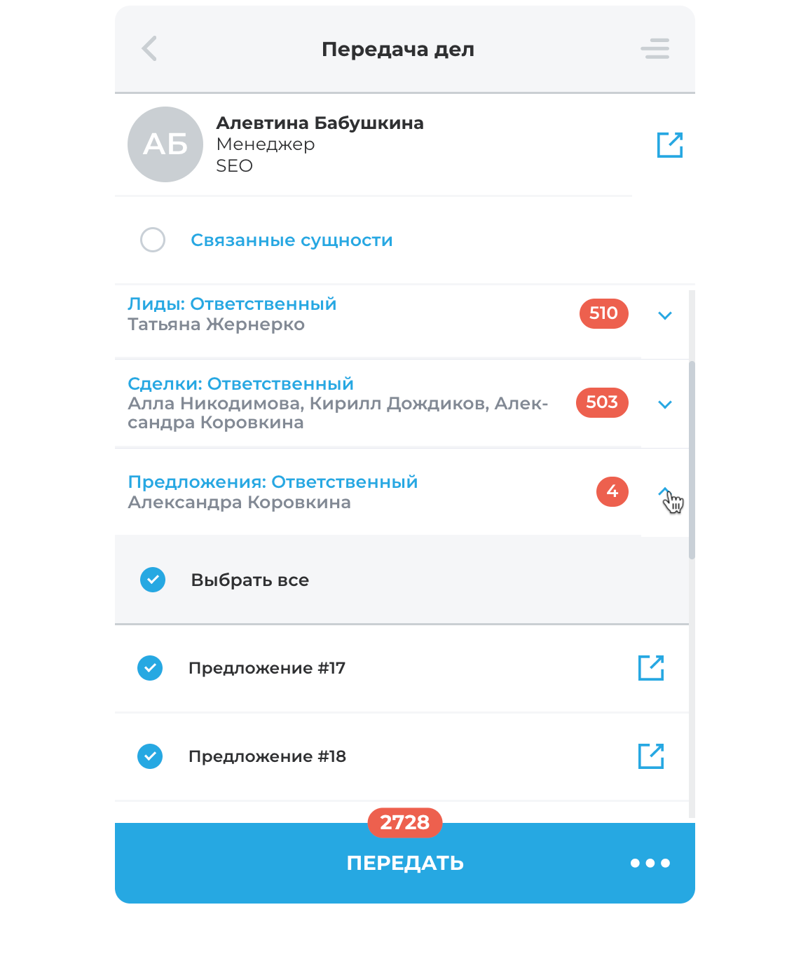 По умолчанию для передачи выбрано сразу всё, однако можно и гибко настроить распределение и назначить разных сотрудников для разных типов данных. Например, передать контакты одному сотруднику, лиды — другому, а компании — третьему.