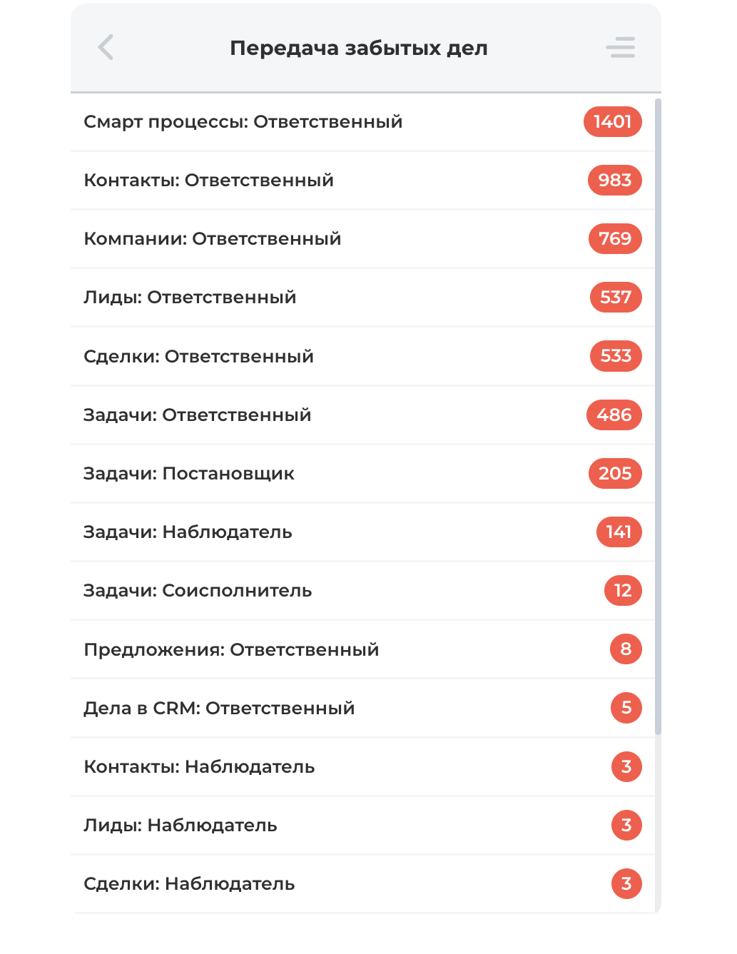 В строке поиска введите Фамилию, Имя или должность сотрудника — и приложение в несколько секунд сформирует список компаний, лидов, сделок, счетов, смарт-процессов и тд. Выбираем преемника или преемников и передаем дела.