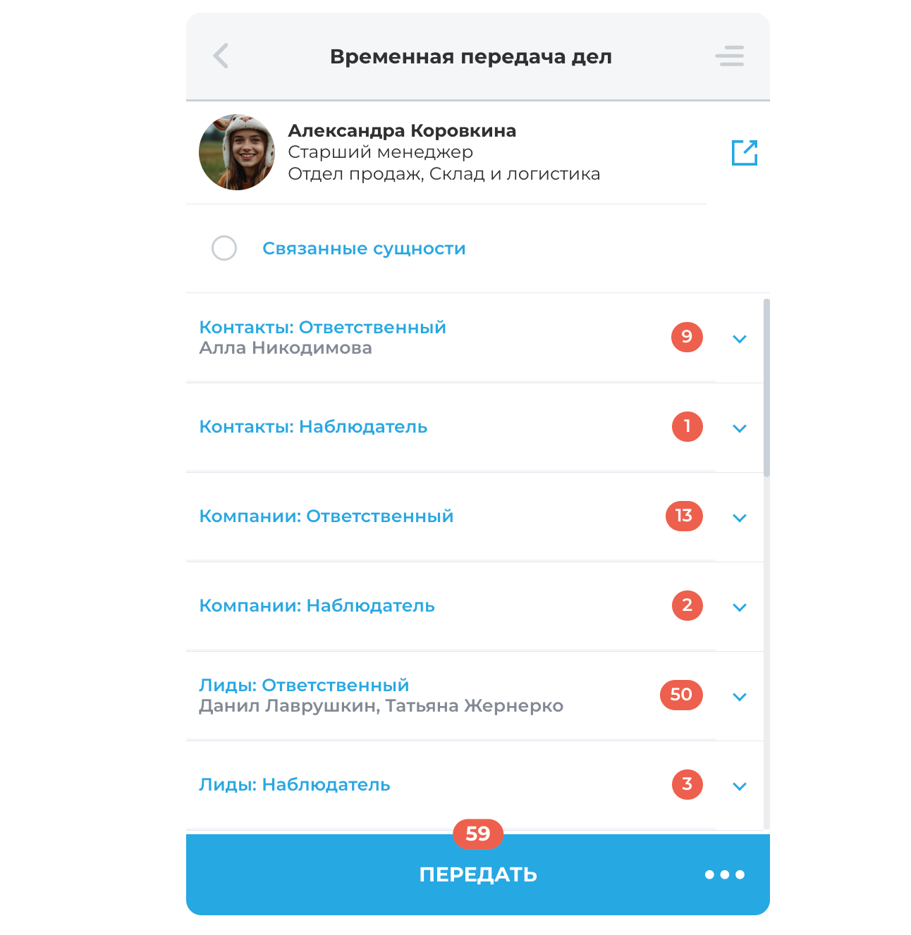 По умолчанию для передачи выбрано сразу всё, однако можно и гибко настроить распределение и назначить разных сотрудников для разных типов данных. Например, передать контакты одному сотруднику, лиды — другому, а компании — третьему.