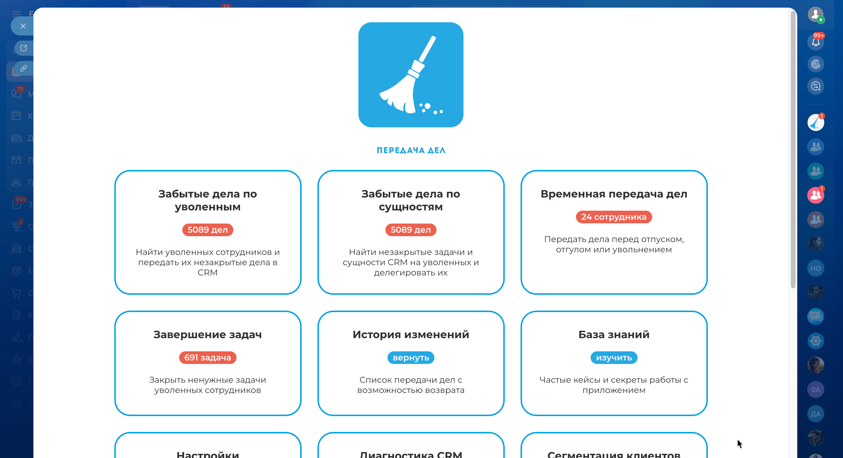 Приложение решает проблему массовой передачи дел другим сотрудникам, помогая поддерживать порядок в CRM, актуальность ответственных и непрерывность работы с клиентами — без ручной рутины и ошибок.