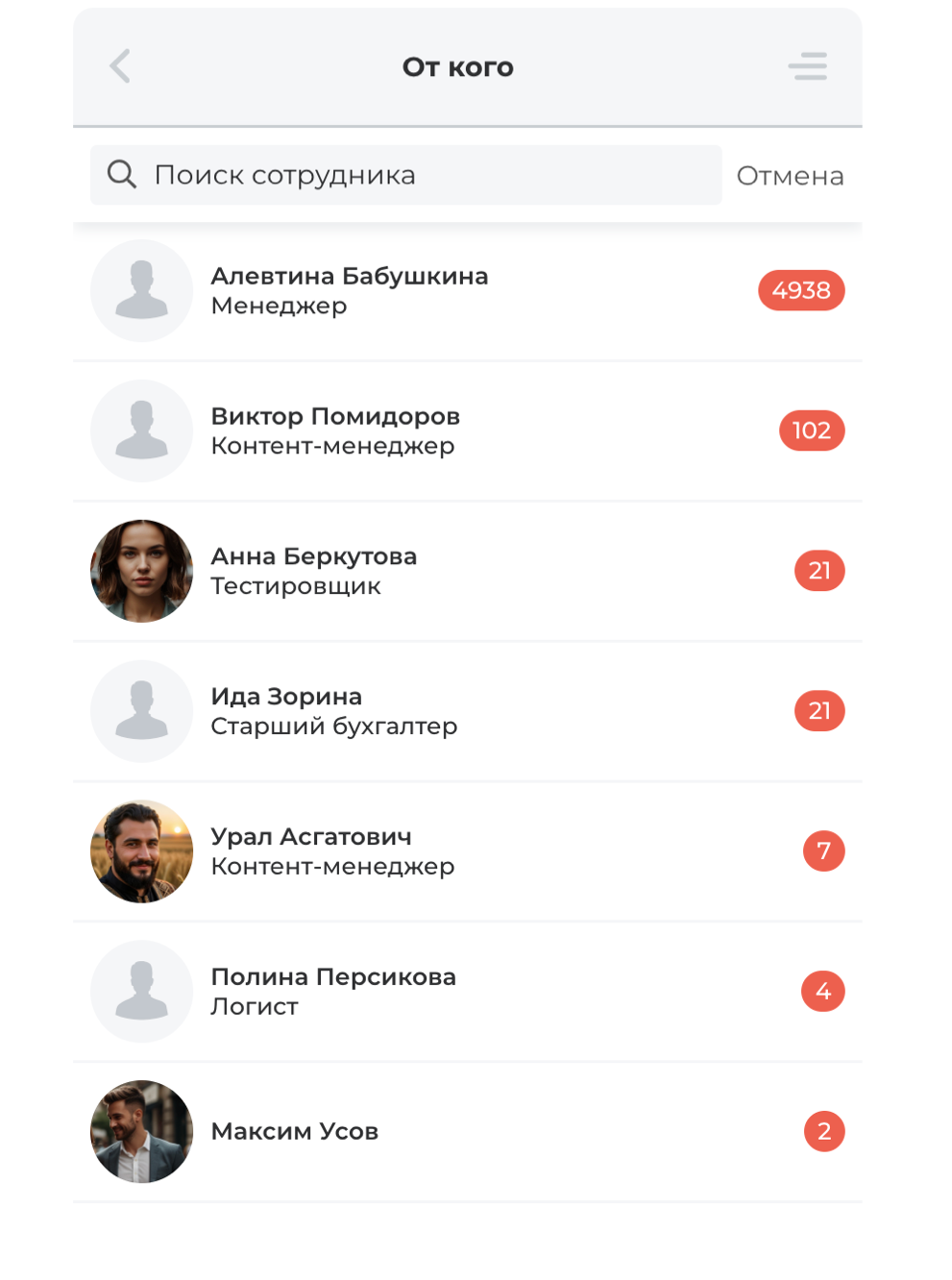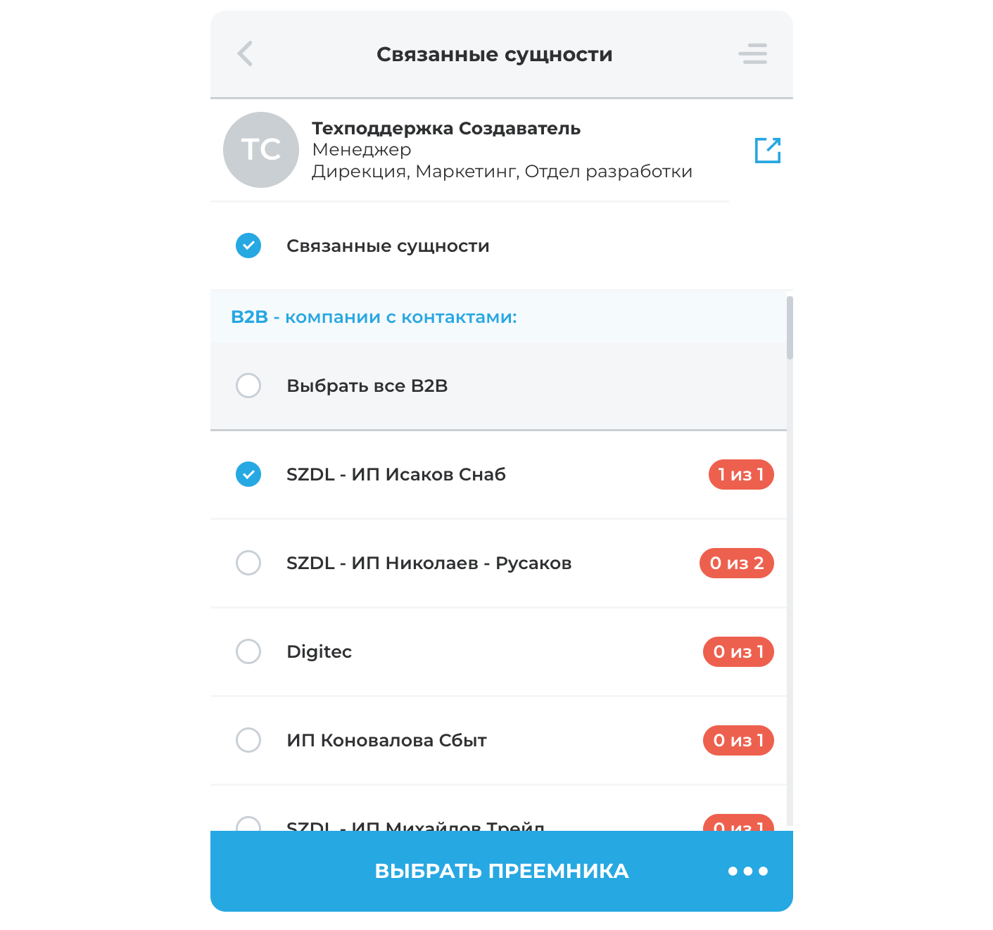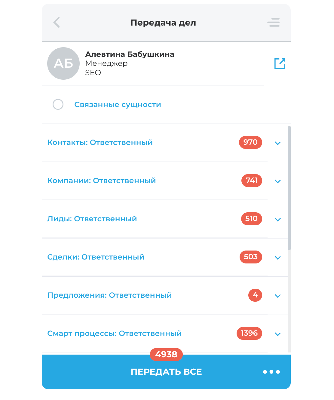 В строке поиска введите Фамилию, Имя или должность сотрудника — и приложение в несколько секунд сформирует список компаний, лидов, сделок, счетов, смарт-процессов и тд. Выбираем преемника или преемников и передаем дела.