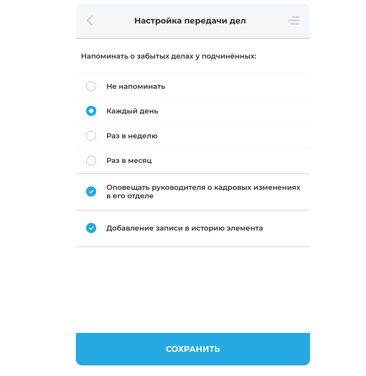 При увольнении сотрудника приложение повторяет напоминания руководителю, пока не будут разобраны все «хвосты». Это помогает избавиться от потерянных дел и поддерживать порядок на портале. Частоту напоминаний можно регулировать в Настройках.