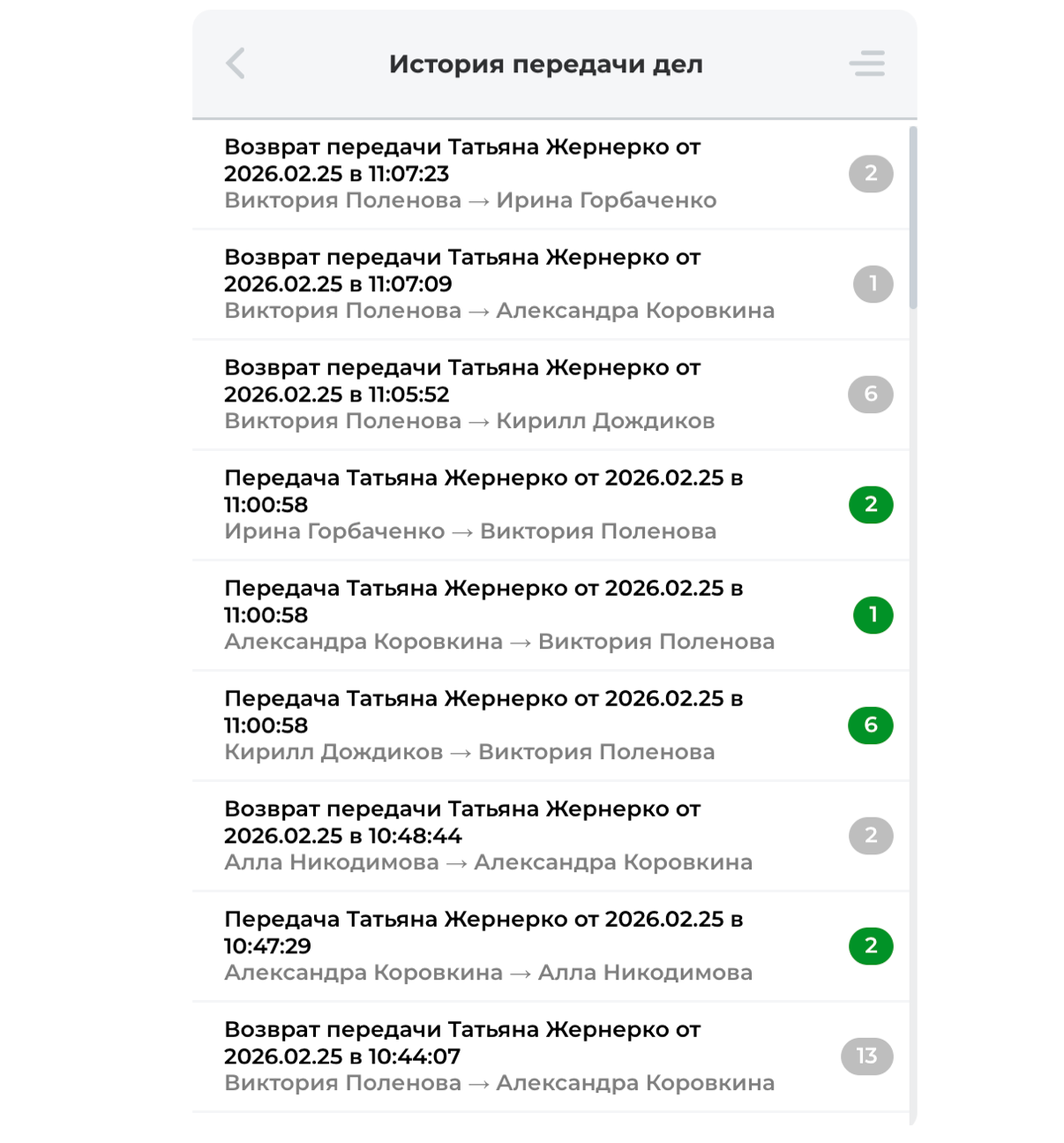 При передаче в таймлайн сущности автоматически добавляется комментарий: «Передано от Иванова к Петрову через приложение "Передача дел"».